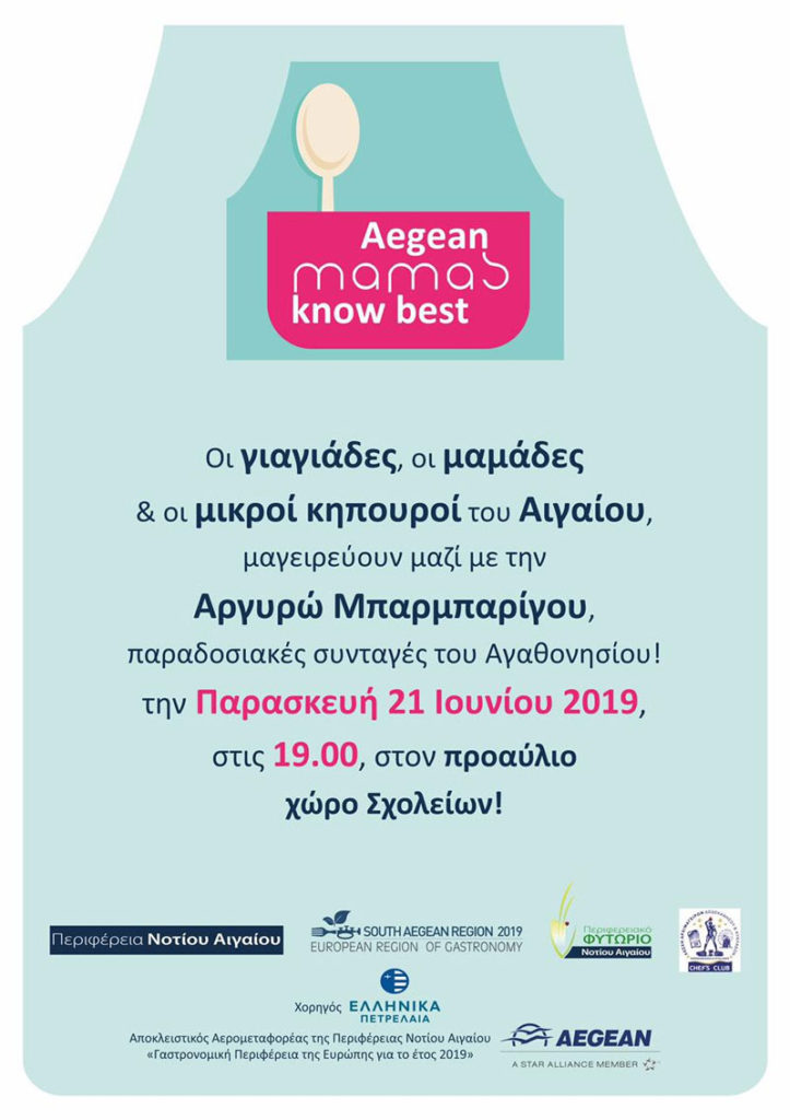Στο πλαίσιο του τίτλου “Περιφέρεια Νοτίου Αιγαίου – Γαστρονομική Περιφέρεια της Ευρώπης 2019”. Στο όμορφο Αγαθονήσι ταξιδεύουν οι δράσεις “Aegean mamas know best” & “Aegean Gardeners”, την Παρασκευή 21 Ιουνίου 2019, ώρα 19.00, στον προαύλιο χώρο των σχολείων. Οι δράσεις αυτές της Περιφέρειας Νοτίου Αιγαίου, πραγματοποιούνται με τη συνεργασία της Λέσχης Αρχιμαγείρων Δωδεκανήσου & Κυκλάδων […]