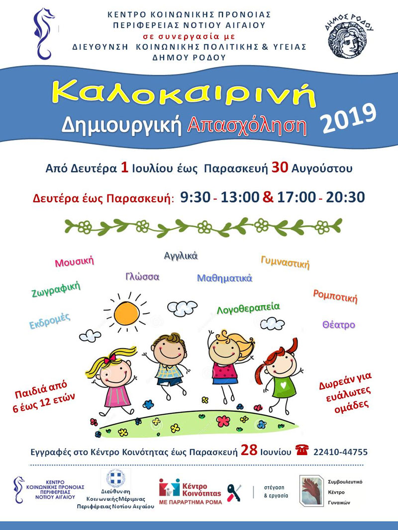 Το Κέντρο Κοινωνικής Πρόνοιας Περιφέρειας Νοτίου Αιγαίου (Κ.Κ.Π.Π.Ν.Α.) υπό την αιγίδα του Υπουργείου Εργασίας, Κοινωνικής Ασφάλισης & Κοινωνικής Αλληλεγγύης, σε συνεργασία με τη Διεύθυνση Κοινωνικής Πολιτικής και Υγείας του Δήμου Ρόδου και τη Διεύθυνση Κοινωνικής Μέριμνας της Περιφέρειας Νοτίου Αιγαίου, διοργανώνουν δωρεάν καλοκαιρινά μαθήματα Δημιουργικής Απασχόλησης Παιδιών, των οποίων οι γονείς ανήκουν σε ευάλωτες ομάδες και αποτελούν ωφελούμενους του Κέντρου Κοινότητας με Παράρτημα Ρομά, του Συμβουλευτικού Κέντρου Γυναικών, της δράσης Γέφυρες Αλληλεγγύης στη Ρόδο του προγράμματος Στέγαση και Εργασία για αστέγους, καθώς και των ωφελουμένων οικογενειών του Κοινωνικού Παντοπωλείου Ρόδου.