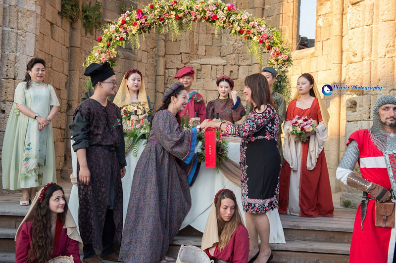 Για τις γαμήλιες εκδηλώσεις, που θα προβληθούν στη Κίνα με σκοπό να προσελκύσουν ζευγάρια τα οποία επιθυμούν να τελέσουν τους γάμους σε ένα ιδιαίτερο προορισμό, αξιοποιήθηκαν το πολιτιστικό πλεονέκτημα του νησιού και οι μοναδικές φυσικές ομορφιές. Συγκεκριμένα, πραγματοποιήθηκαν δύο ξεχωριστές γαμήλιες τελετές, ένας θεματικός μεσαιωνικός γάμος στην Παλιά Πόλη με τα ζευγάρια να φορούν ενδυμασίες εποχής και να συνοδεύονται από έφιππους ιππότες. Η δεύτερη γαμήλια τελετή, σε μοντέρνο, ρομαντικό ύφος έλαβε χώρα στο μνημείο των Πηγών Καλλιθέας με τα ζευγάρια να φωτογραφίζονται με φόντο το απέραντο Αιγαίο.