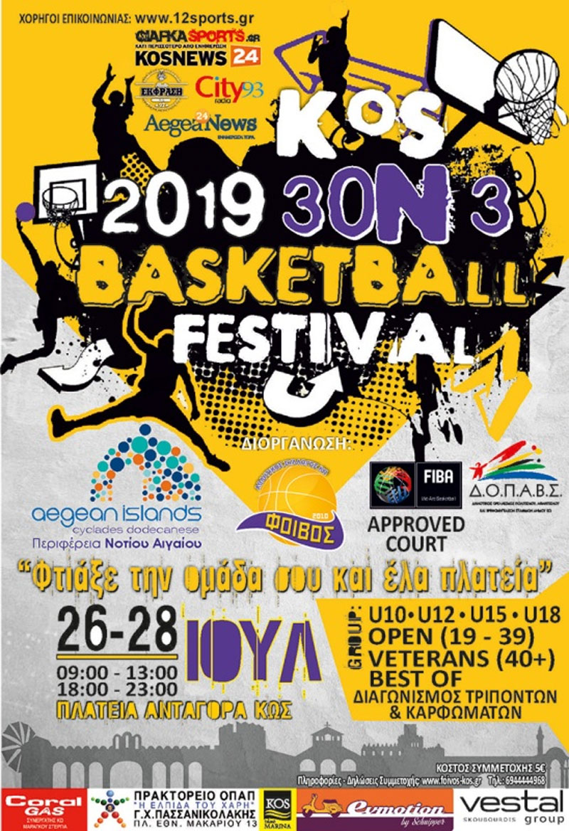 Η Περιφέρεια Νοτίου Αιγαίου, συνδιοργανώνει με τον «Α.Σ. ΦΟΙΒΟΣ ΚΩ», το Επαρχείο Κω και τον Δ.Ο.Π.Α.Β.Σ του Δήμου Κω, από 26 έως 28 Ιουλίου 2019, τουρνουά καλαθοσφαίρισης 3 εναντίον 3 για όλες τις ηλικίες.