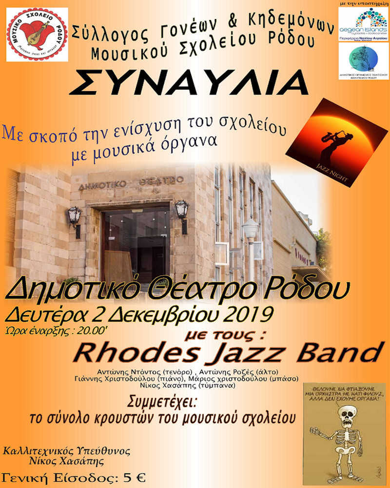 Σε μουσική ανάταση με jazz μουσική καλεί το κοινό της Ρόδου ο Σύλλογος Γονέων και Κηδεμόνων του Μουσικού Σχολείου. Η συναυλία θα πραγματοποιηθεί τη Δευτέρα 2-12-2019, στις 8 μ.μ., στο Δημοτικό Θέατρο και σκοπό έχει τη συγκέντρωση χρημάτων για την ενίσχυση του σχολείου με μουσικά όργανα. Η συναυλία θα πραγματοποιηθεί χάρη στην αφιλοκερδή συμμετοχή της […]