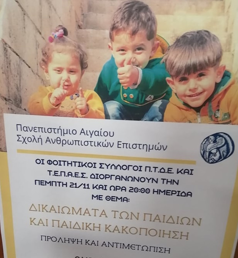 Μεγάλη επιτυχία σημείωσε η εσπερίδα που οργάνωσαν οι φοιτητικοί σύλλογοι του Παιδαγωγικού τμήματος Δημοτικής Εκπαίδευσης (Π.Τ.Δ.Ε) και των Επιστημών της Προσχολικής Αγωγής και του Εκπαιδευτικού Σχεδιασμού (Τ.Ε.Π.Α.Ε.Σ.) του Πανεπιστημίου Αιγαίου με θέμα «Δικαιώματα των Παιδιών και Παιδική Κακοποίηση» στο πλαίσιο της Παγκόσμιας Ημέρας Δικαιωμάτων του Παιδιού.