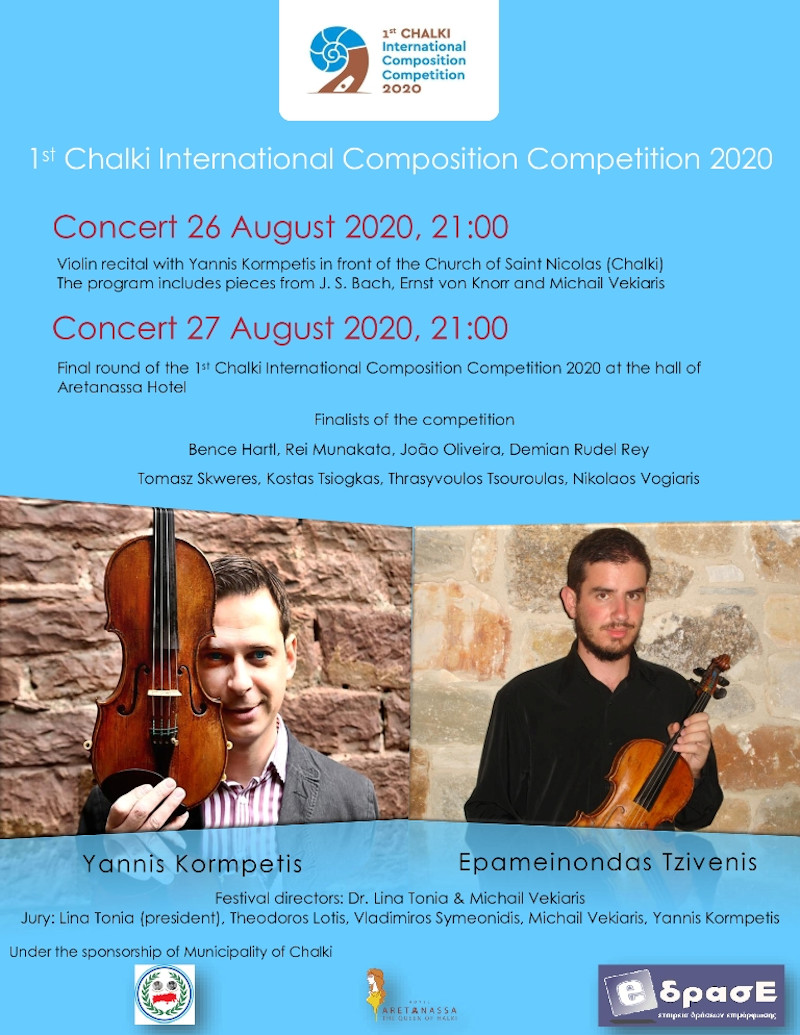 Το ‘‘κάλεσμα’’ για τον «1st Chalki International Composition Competition 2020» προκάλεσε το άμεσο ενδιαφέρον συνθετών από όλο τον κόσμο. Συνολικά, υπεβλήθησαν 113 συνθέσεις, διάρκειας τριών έως οκτώ λεπτών. Από την πρώτη φάση της διαγωνιστικής διαδικασίας επελέγησαν οι οκτώ φιναλίστ. Η τελική φάση του διαγωνισμού θα γίνει την Πέμπτη 27 Αυγούστου, στο συνεδριακό χώρο του ξενοδοχείου ‘‘Aretanassa’’ της Χάλκης. Εκεί, οι βιολιστές Γιάννης Κορμπέτης και Επαμεινώνδας Τζιβένης θα παρουσιάσουν τα έργα που ξεχώρισαν και θα γίνει η ανάδειξη των τριών μεγάλων νικητών.