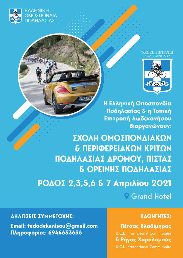 Κατά τη διάρκεια των διεθνών αγώνων ποδηλασίας, που θα γίνουν στη Ρόδο πρόκειται να πραγματοποιηθεί σχολή ομοσπονδιακών και περιφερειακών κριτών δρόμου, πίστας και ορεινής ποδηλασίας, που θα γίνει από 2 έως 7 Απριλίου 2021. Η σχολή γίνεται μετά από συντονισμένες προσπάθειες της Τ.Ε. Ποδηλασίας, στο πλαίσιο της ανάπτυξης του αθλήματος. Αναλυτικά, όλες οι λεπτομέρειες για […]