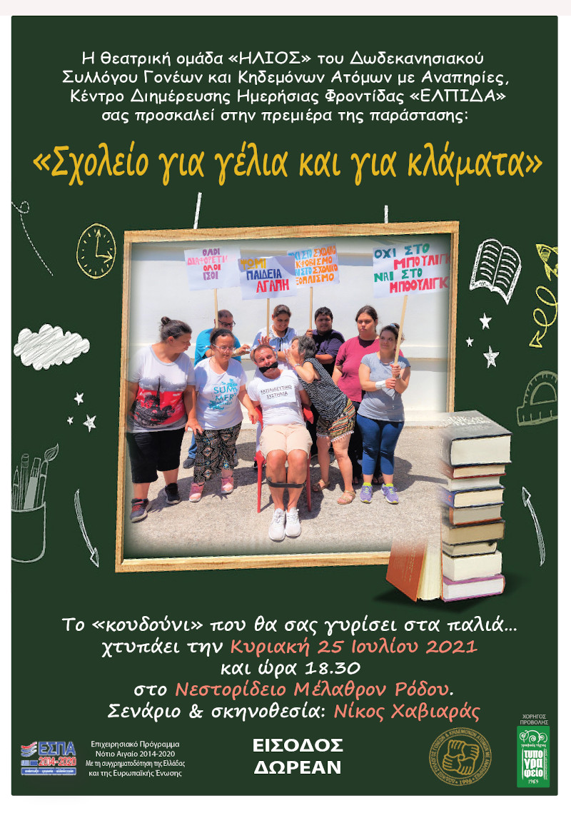 Η θεατρική ομάδα «ΗΛΙΟΣ» του Δωδεκανησιακού Συλλόγου Γονέων και Κηδεμόνων Ατόμων με Αναπηρίες, Κέντρο Ημερήσιας Φροντίδας «ΕΛΠΙΔΑ» σας προσκαλεί στην πρεμιέρα της παράστασης: