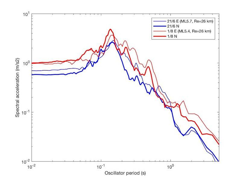 Παρά το υψηλότερο μέγεθος του 1ου σεισμού, η κορυφαία εδαφική επιτάχυνση (PGA) ήταν 40% υψηλότερη στον 2ο σεισμό (0.07g έναντι 0.10g). Η κορυφαία εδαφική επιτάχυνση (PGA) χαρακτηρίζει την ένταση ταλάντωσης της επιφάνειας του εδάφους.