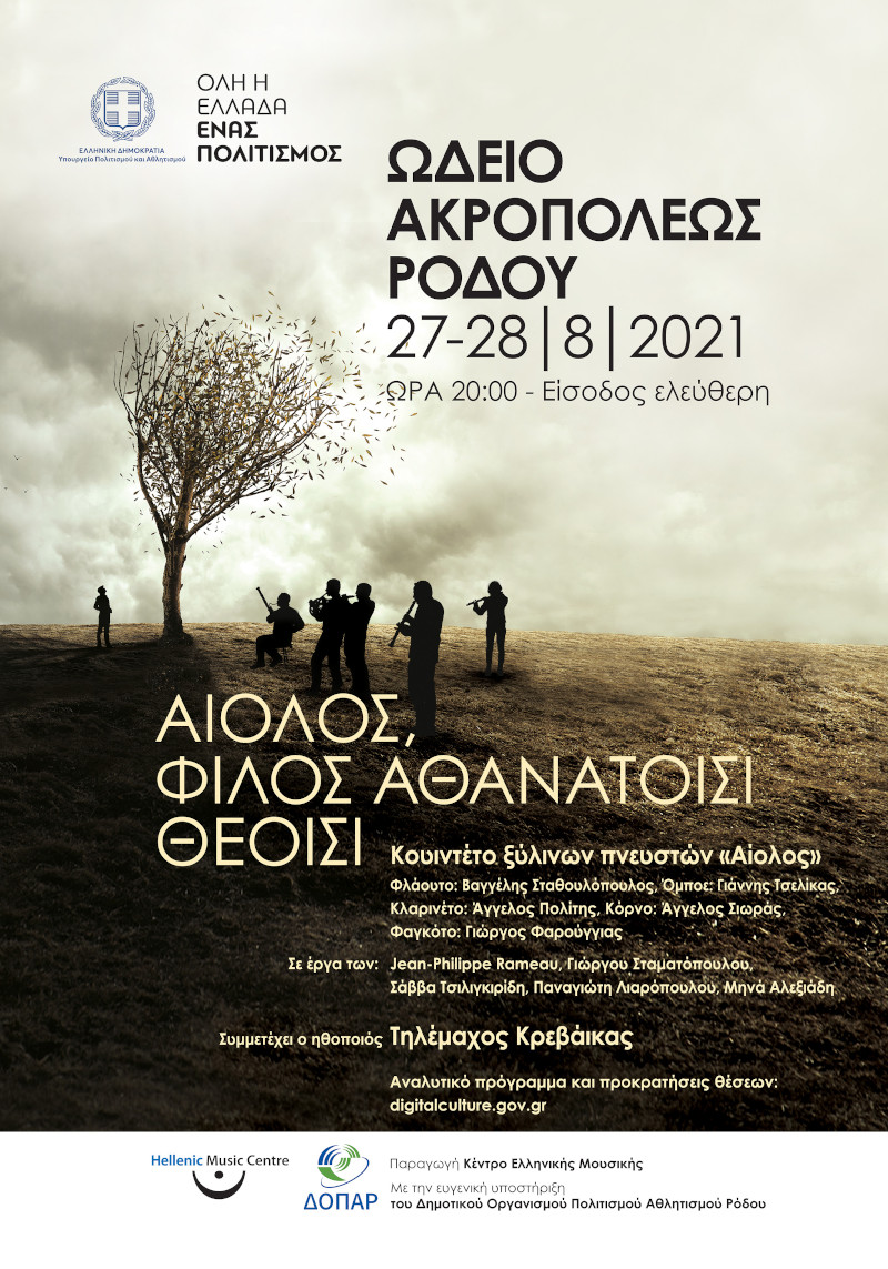 Την Παρασκευή 27 και το Σάββατο 28 Αυγούστου 2021, στις 20:00, στο Ωδείο Ακροπόλεως Ρόδου, το κουιντέτο πνευστών «Αίολος» και ο ηθοποιός Τηλέμαχος Κρεβάικας παρουσιάζουν μια παράσταση αφιερωμένη στην μουσική των ανέμων. Η παράσταση εντάσσεται στο πρόγραμμα 2021 του θεσμού «Όλη η Ελλάδα ένας Πολιτισμός» του Υπουργείου Πολιτισμού και Αθλητισμού.