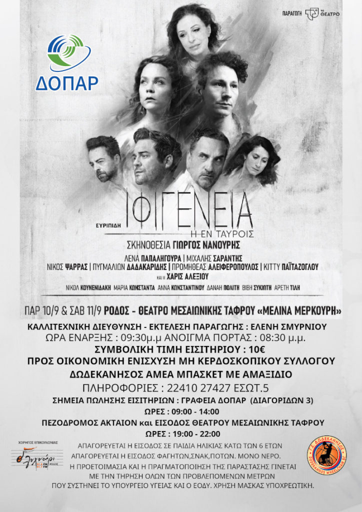 Ο Δημοτικός Οργανισμός Πολιτισμού και Αθλητισμού Ρόδου (ΔΟΠΑΡ) στο πλαίσιο των θερινών πολιτιστικών εκδηλώσεων του νησιού μας συνεχίζει να προσφέρει σε όλους εμάς τις πιο αξιόλογες παραστάσεις του φετινού Φεστιβάλ Επιδαύρου παρουσιάζοντας την αρχαία τραγωδία του Ευριπίδη “ΙΦΙΓΈΝΕΙΑ Η ΕΝ ΤΑΎΡΟΙΣ” σε σκηνοθεσία Γιώργου Νανούρη. Θέλοντας να προσδώσει φιλανθρωπικό χαρακτήρα και σ’ αυτό το πολύ σημαντικό πολιτιστικό γεγονός στο νησί […]