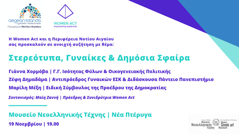 Η Περιφέρεια Νοτίου Αιγαίου και η μη κερδοσκοπική οργάνωση Women Act σας προσκαλούν σε ανοιχτή συζήτηση με θέμα: Στερεότυπα, Γυναίκες και Δημόσια Σφαίρα. Για τη συμμετοχή στην εκδήλωση είναι απαραίτητη: – η επίδειξη πιστοποιητικού εμβολιασμού ή νόσησης τελευταίου εξαμήνου ή ψηφιακής βεβαίωσης από το gov.gr αρνητικού rapid test που έχει διενεργηθεί εντός 48 ωρών από διαγνωστικό […]