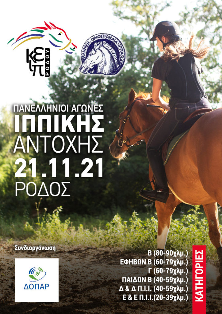 Ο Όμιλος Κέντρο Εκπαιδεύσεως Ιππασίας Ρόδου (Κ.Ε.Ιπ Ρόδου) με συνδιοργανωτή τον Δημοτικό Οργανισμό Πολιτισμού Αθλητισμού Ρόδου (Δ.Ο.Π.Α.Ρ.) και υπό την αιγίδα της Ελληνικής Ομοσπονδίας Ιππασίας διοργανώνουν Πανελλήνιους Αγώνες Ιππικής Αντοχής, στις εγκαταστάσεις του ομίλου. Ο αγώνας θα πραγματοποιηθεί την Κυριακή 21 Νοεμβρίου και ώρα 07:00. Οι συμμετοχές είναι από όλη την Ελλάδα αφού πρόκειται για […]