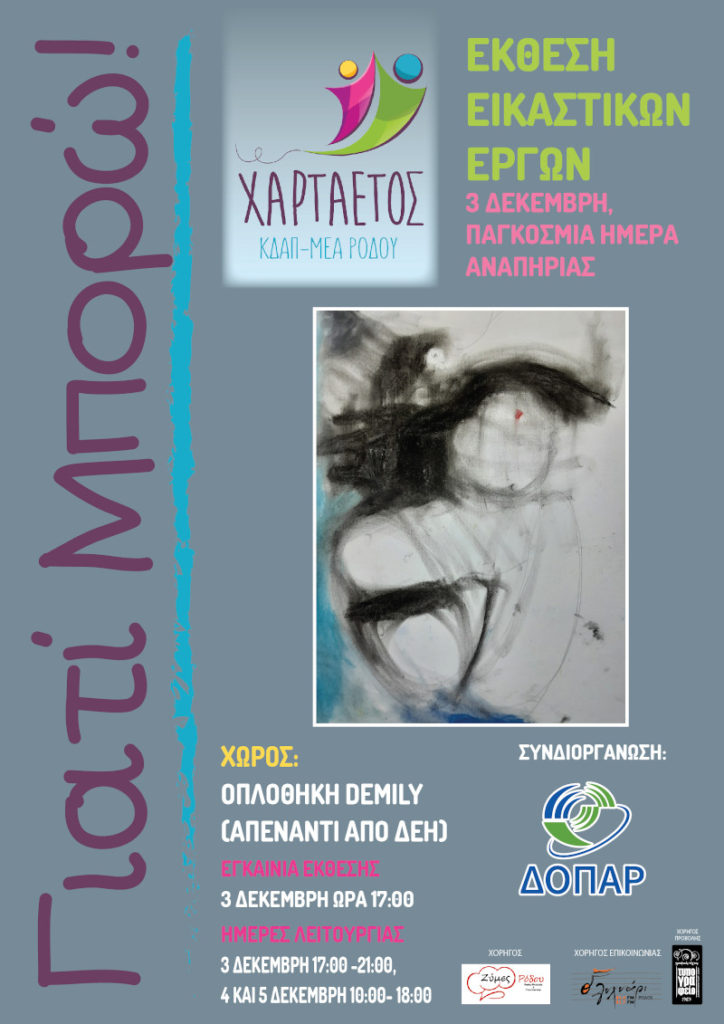 Με αφορμή την Παγκόσμια Ημέρα Αναπηρίας, 3 Δεκεμβρίου, το ΚΔΑΠ – ΜΕΑ ΧΑΡΤΑΕΤΟΣ ΡΟΔΟΥ (Κέντρο Δημιουργικής Απασχόλησης Ατόμων με Αναπηρία) με συνδιοργανωτή τον Δημοτικό Οργανισμό Πολιτισμού Αθλητισμού Ρόδου (Δ.Ο.Π.Α.Ρ.) παρουσιάζουν στην κοινωνία της Ρόδου, εικαστικές δημιουργίες των ωφελούμενων παιδιών του κέντρου. Είναι η μέρα που εμείς διαλέξαμε να εστιάσουμε την προσοχή μας στις δυνατότητες- ικανότητες […]