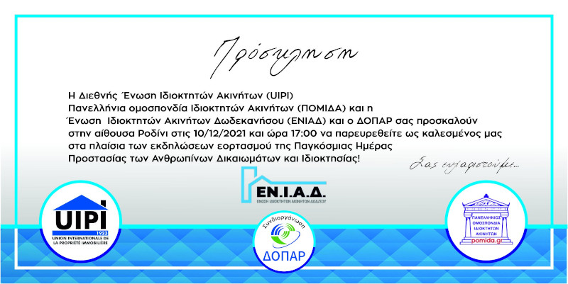 Η Διεθνής Ένωσις Ιδιοκτητών Ακινήτων (UIPI), η ΠΟΜΙΔΑ και η ΕΝΩΣΗ ΙΔΙΟΚΤΗΤΩΝ ΑΚΙΝΗΤΩΝ ΔΩΔΕΚΑΝΗΣΟΥ και ο ΔΟΠΑΡ προσκαλούν τους ιδιοκτήτες ακινήτων Ρόδου και Δωδεκανήσου να συμμετάσχουν σε ΕΝΗΜΕΡΩΤΙΚΗ ΕΚΔΗΛΩΣΗ την ΠΑΡΑΣΚΕΥΗ, 10η ΔΕΚΕΜΒΡΙΟΥ 2021 ΚΑΙ ΩΡΑ 5 μ.μ., στην Αίθουσα «Ροδίνι» (Πάρκου) του Δήμου Ρόδου, με τα εξής θέματα ενημέρωσης και συζήτησης: *Εορτασμός της 10ης […]