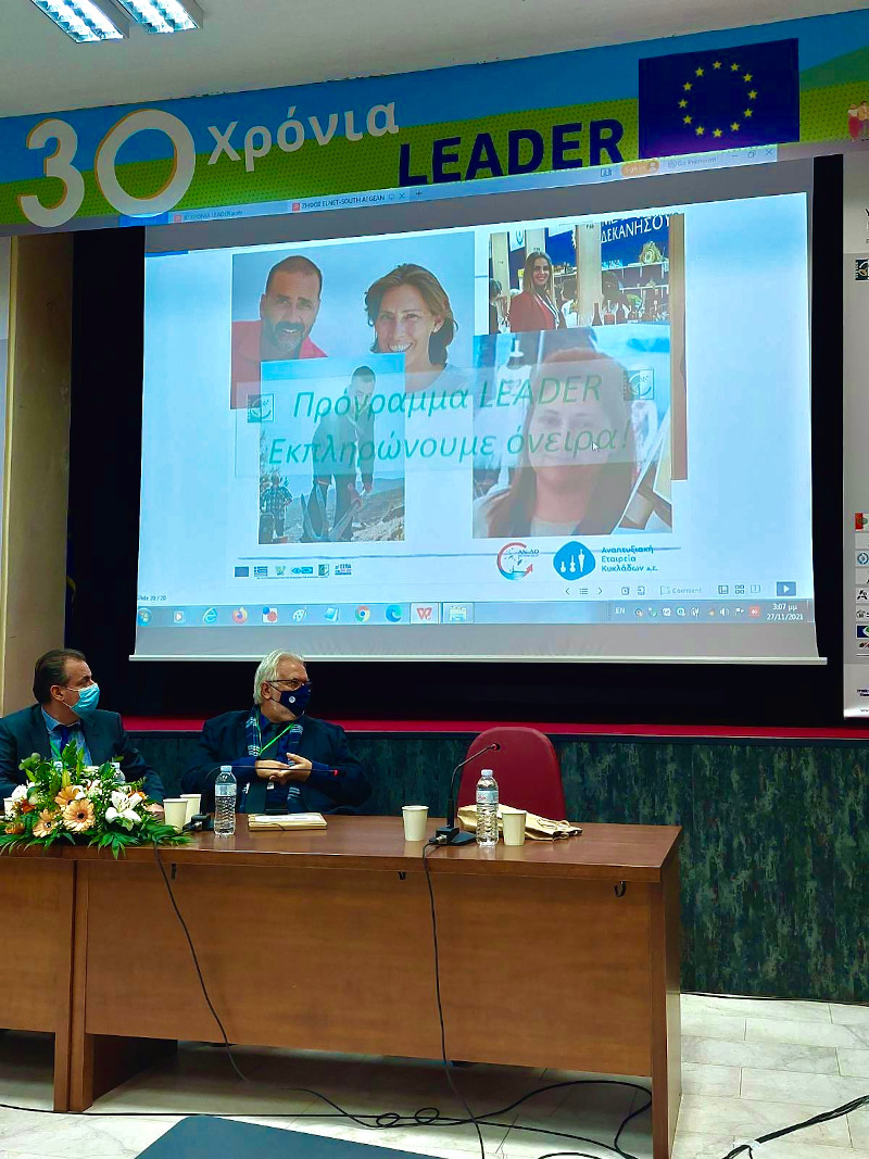 Τη δεύτερη μέρα, παρουσιάσθηκαν ανά περιφέρεια τα επιτεύγματα των προγραμμάτων LEADER στις περιοχές της υπαίθρου και στα νησιά της Ελλάδας. Την παρουσίαση για το Νότιο Αιγαίο, ανέλαβε ο Διευθυντής της ΑΝΔΩ κ. Κων/νος Ζήφος, ο οποίος ανέλυσε τη σημαντική συμβολή του προγράμματος στις μικροοικονομίες των νησιών μας. Έργα χαμηλού προϋπολογισμού, επενδύσεις στη μεταποίηση αγροτικής παραγωγής, μικρά έργα στον πολιτισμό, βελτιώνουν την ποιότητα ζωής των κατοίκων των μικρών νησιών, δημιουργούν νέες θέσεις εργασίας και συμβάλουν στη συγκράτηση των οικογενειών στα μικρά νησιά. Αυτό προκύπτει από οικονομικά και στατιστικά στοιχεία που παρουσιάσθηκαν, αλλά κυρίως από τις «ιστορίες επιτυχίας» δικαιούχων προηγούμενων εφαρμογών του LEADER. Δεν πρέπει να ξεχνάμε «εμβληματικές επενδύσεις» στα νησιά μας, όπως είναι τα οινοποιεία στους Λειψούς, στην Πάτμο, οι αποκαταστάσεις μνημείων αγροτικής κληρονομιάς στα χωριά και στα νησιά μας (π.χ. μάγγανο Λαχανιάς, μύλος στην Όλυμπο), το τυροκομείο στην Κάλυμνο ή και οι υπό κατασκευή μονάδες παραγωγής ξυδιού και χυμού ροδιού στη Ρόδο, το πρώτο οινοποιείο στην Κάρπαθο και άλλα πολλά τα οποία υλοποιήθηκαν με τη βοήθεια της ΑΝΔΩ και του προγράμματος LEADER.