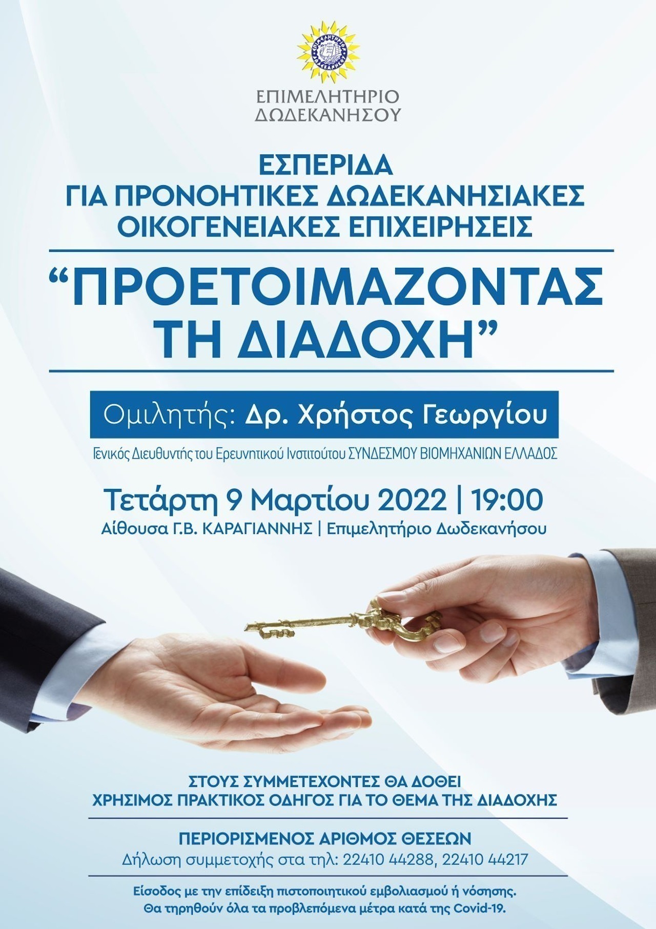 Την Τετάρτη 9 Μαρτίου και ώρα 19:00 θα πραγματοποιηθεί εσπερίδα με θέμα “Προετοιμάζοντας τη διαδοχή”, μία άκρως ενδιαφέρουσα και χρήσιμη εκδήλωση τόσο για όσους σκέφτονται να παραδώσουν την επιχείρηση στη νέα γενιά όσο και για τους νέους που αποφασίζουν να συνεχίσουν την οικογενειακή επιχείρηση.