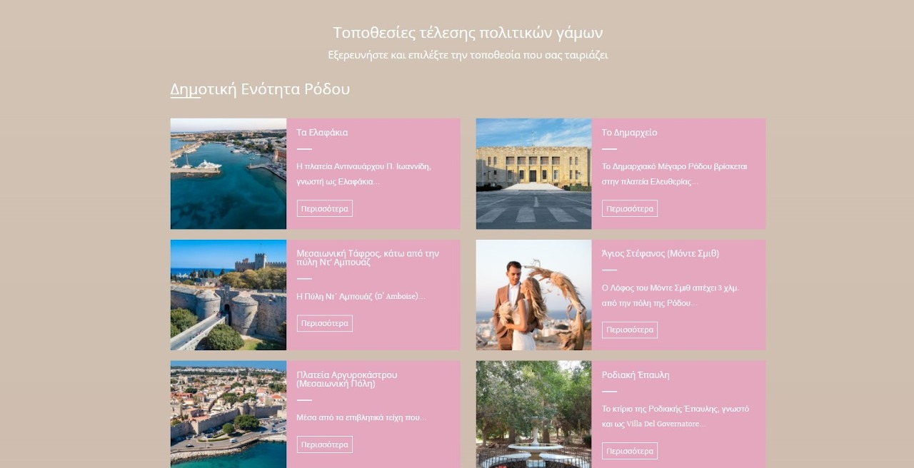 Ο κ. Σπύρος Σπυρόπουλος τόνισε από την πλευρά του ότι: «Στο πλαίσιο του ψηφιακού μετασχηματισμού του Δήμου Ρόδου και της διεύρυνσης των προσφερόμενων ηλεκτρονικών υπηρεσιών προς το δημότη αλλά και προς τον επισκέπτη, αναπτύχθηκε ιστοσελίδα με αποκλειστικό περιεχόμενο την τέλεση πολιτικών γάμων στο νησί της Ρόδου. Μέσα από την ιστοσελίδα παρέχονται σε Ελληνική & Αγγλική γλώσσα, όλες οι απαραίτητες πληροφορίες και φωτογραφικό υλικό των σημείων τέλεσης των γάμων.