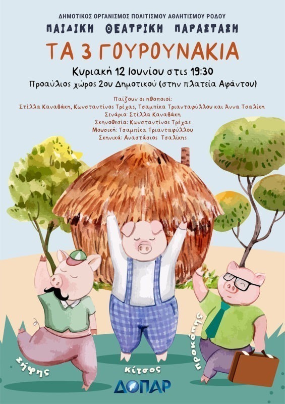 Ο Δημοτικός Οργανισμός Πολιτισμού Αθλητισμού Ρόδου συνεχίζει την σειρά παιδικών παραστάσεων με τίτλο «Τα 3 γουρουνάκια» που θα πραγματοποιηθεί σε Δημοτικές Ενότητες του νησιού μας.