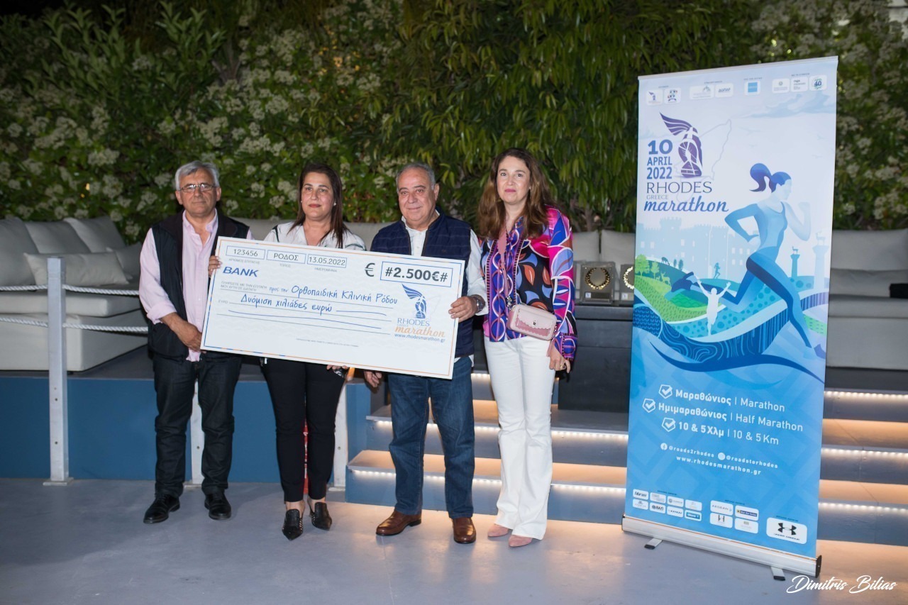 Πριν τις απονομές των αναμνηστικών πλακετών, ο Διεθνής Μαραθώνιος Δρόμος Ρόδου έδειξε και το κοινωνικό του πρόσωπο, προσφέροντας δύο δωροεπιταγές στη Ορθοπαιδική Κλινική του Νοσοκομείου Ρόδου και στην εθελοντική ομάδα ΕΟΠΚ C.B. ΔΩΔΕΚΑΝΗΣΟΥ – ΕΘΕΛΟΝΤΙΚΗ ΟΜΑΔΑ ΠΡΟΛΗΨΗΣ ΚΑΤΑΣΤΡΟΦΩΝ για την κάλυψη αναγκών τους.