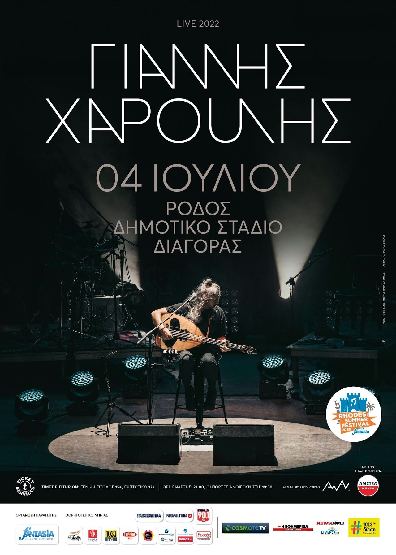 Ο Γιάννης Χαρούλης και οι μουσικοί του συνεχίζουν τις καλοκαιρινές συναυλίες και υπόσχονται να μοιραστούν μαζί μας τραγούδια, μουσικές και χαρές που όλοι έχουμε ανάγκη, στο Δημοτικό Στάδιο «Διαγόρας» της Ρόδου.