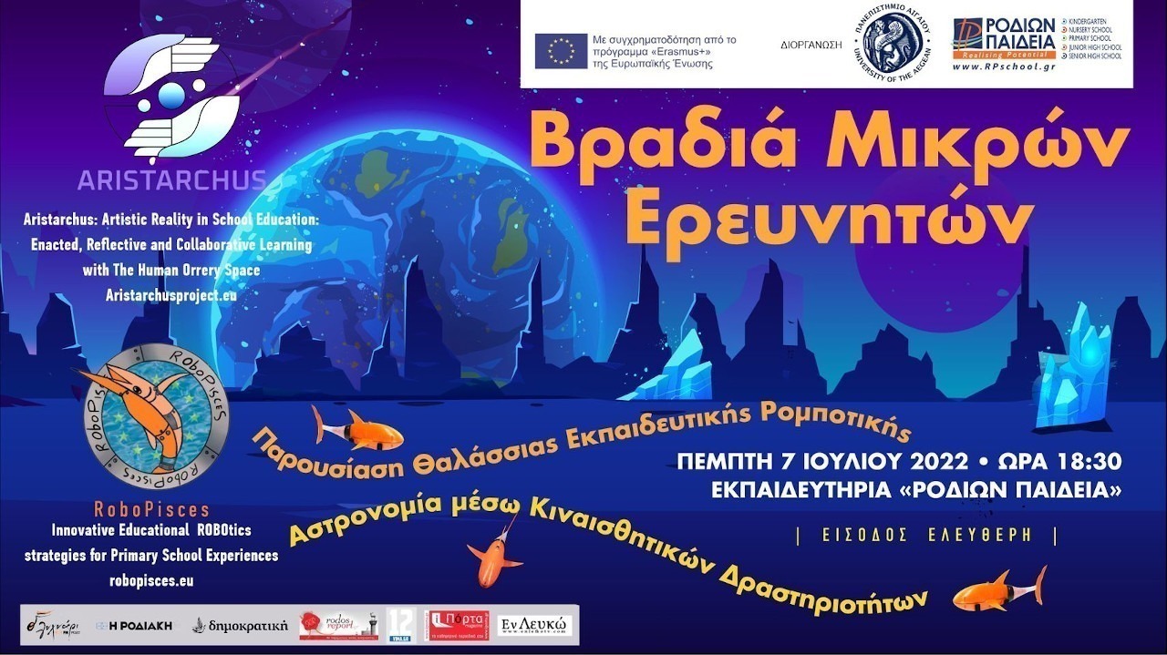 Το Πανεπιστήμιο Αιγαίου σε συνεργασία με τα Εκπαιδευτήρια “ΡΟΔΙΩΝ ΠΑΙΔΕΙΑ» διοργανώνουν «Βραδιά Μικρών Ερευνητών» την Πέμπτη 7 Ιουλίου 2022, 18:30 – 21:30, στις εγκαταστάσεις των Εκπαιδευτηρίων στη Ρόδο (Ηλία Βενέζη, Ρόδος). Σκοπός της εκδήλωσης είναι η παρουσίαση των αποτελεσμάτων του έργου θαλάσσιας εκπαιδευτικής ρομποτικής “RoboPisces” που ολοκληρώνεται τον Αύγουστο του 2022 και η παρουσίαση του […]