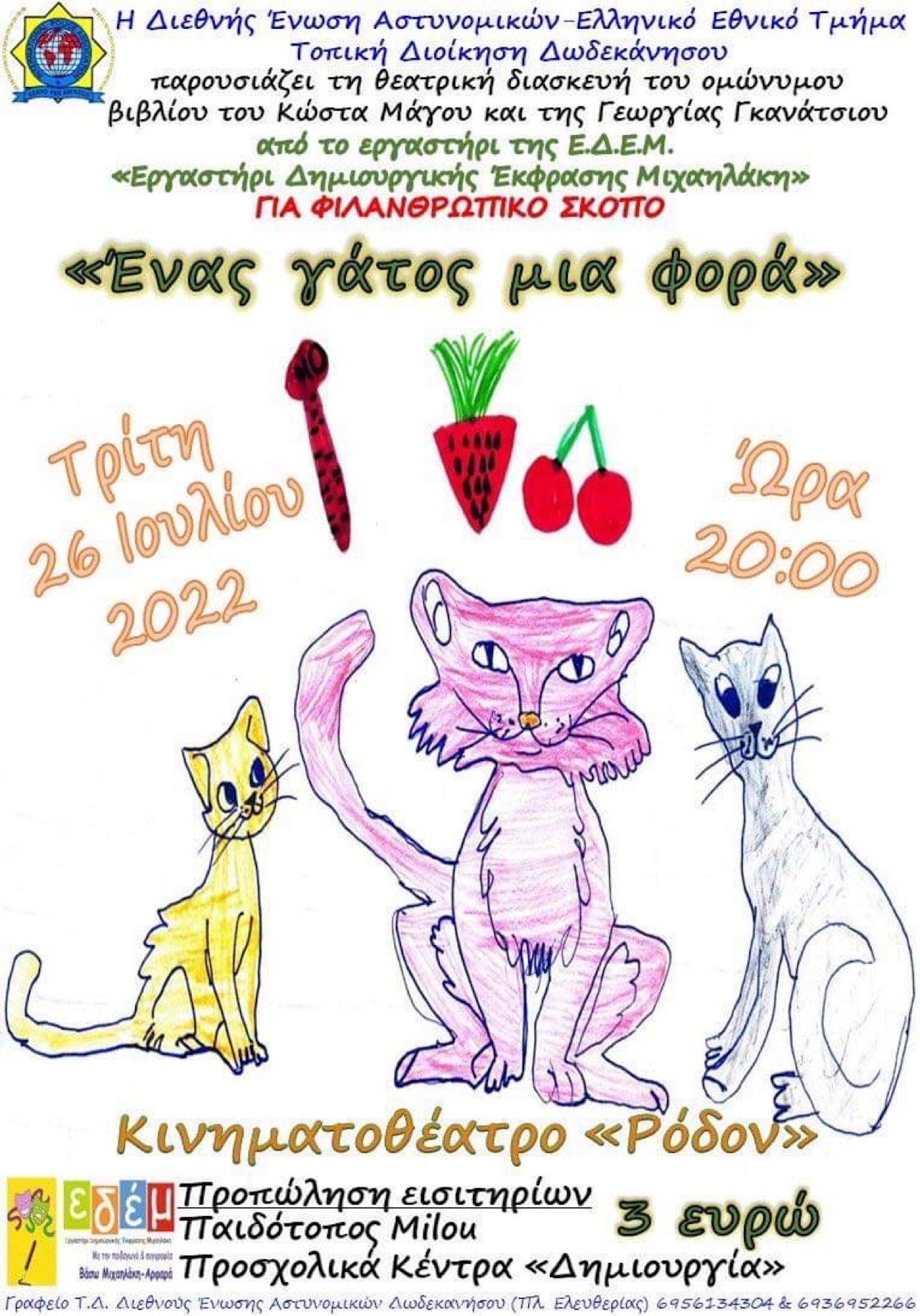 Η Διεθνής Ένωση Αστυνομικών/Τοπική Διοίκηση Δωδεκανήσου, σας προσκαλεί την Τρίτη (26-07-2022) και ώρα 20.00, στο θερινό κινηματοθέατρο «ΡΟΔΟΝ», στην παιδική θεατρική παράσταση με τίτλο «Ένας γάτος μια φορά», από το Εργαστήρι Δημιουργικής Έκφρασης Μιχαηλάκη (Ε.Δ.Ε.Μ.), η οποία παρουσιάζεται στο πλαίσιο των κοινωνικών μας δράσεων, για φιλανθρωπικό σκοπό.
