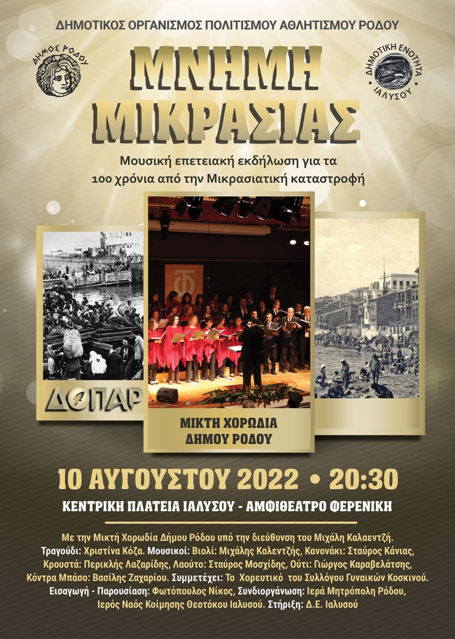 Στο πλαίσιο των πολιτιστικών εκδηλώσεων ΙΑΛΥΣΙΑ 2022, την Τετάρτη 10 Αυγούστου 2022 και ώρα 20:30, στο Αμφιθέατρο «Φερενίκη» της κεντρικής πλατείας της Δημοτικής Ενότητας Ιαλυσού, ο Δημοτικός Οργανισμός Πολιτισμού Αθλητισμού Ρόδου, συνδιοργανώνει με τον Δήμο Ρόδου, την Ιερά Μητρόπολη Ρόδου, τον Ιερό Ναό Κοίμησης Θεοτόκου Ιαλυσού και τη Δημοτική Ενότητα Ιαλυσού τη μουσικό-χορευτική εκδήλωση με […]