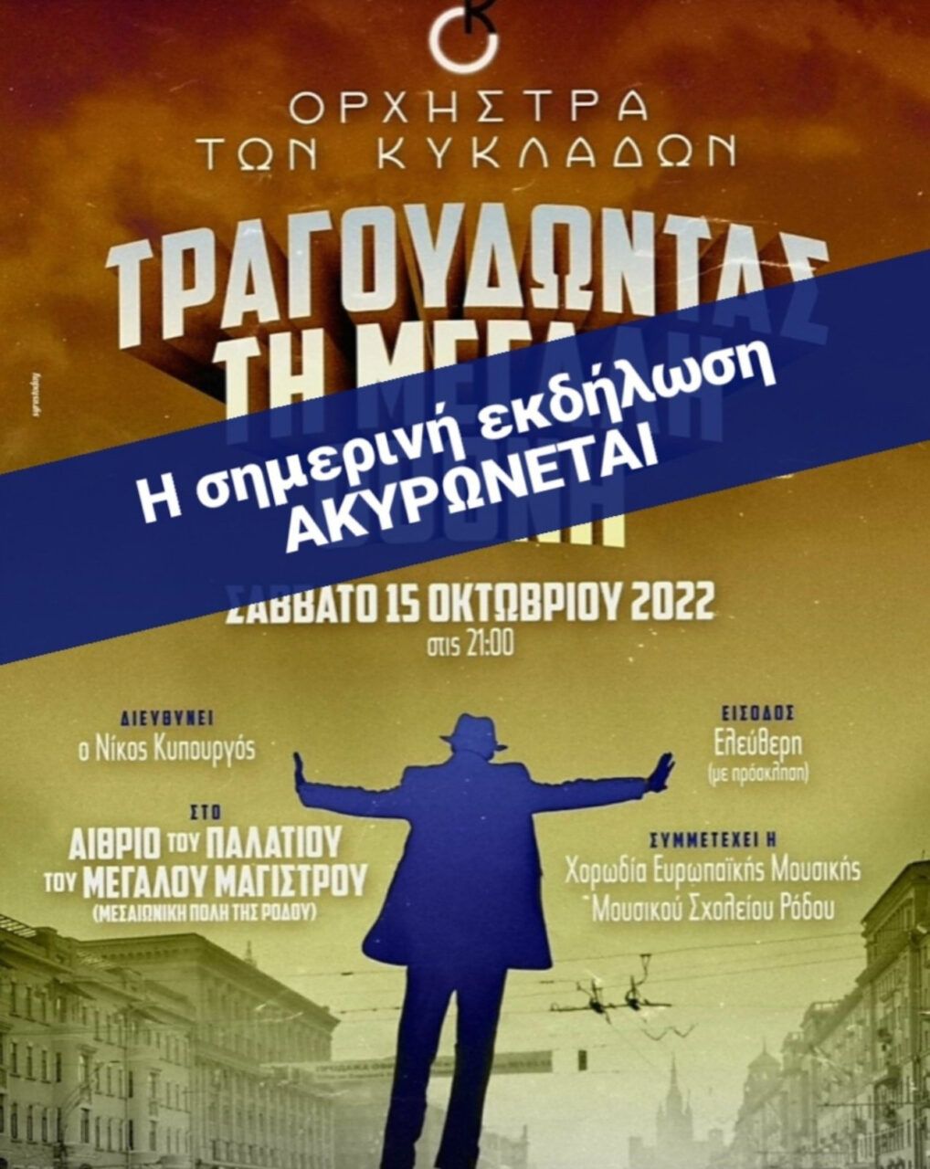 Αναβλήθηκε εκτάκτως η προγραμματισμένη για απόψε συναυλία «Τραγουδώντας τη Μεγάλη Οθόνη» με την Ορχήστρα των Κυκλάδων λόγω των ακραίων καιρικών φαινομένων