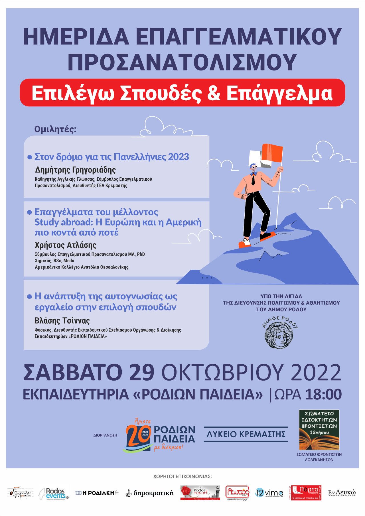 Το Ημερήσιο Γενικό Λύκειο Κρεμαστής, τα Εκπαιδευτήρια «ΡΟΔΙΩΝ ΠΑΙΔΕΙΑ» και το Σωματείο Ιδιοκτητών Φροντιστών Δωδεκανήσου διοργανώνουν Σεμινάριο Επαγγελματικού Προσανατολισμού υπό την αιγίδα της Διεύθυνσης Παιδείας, Αθλητισμού και Πολιτισμού του Δήμου Ρόδου,