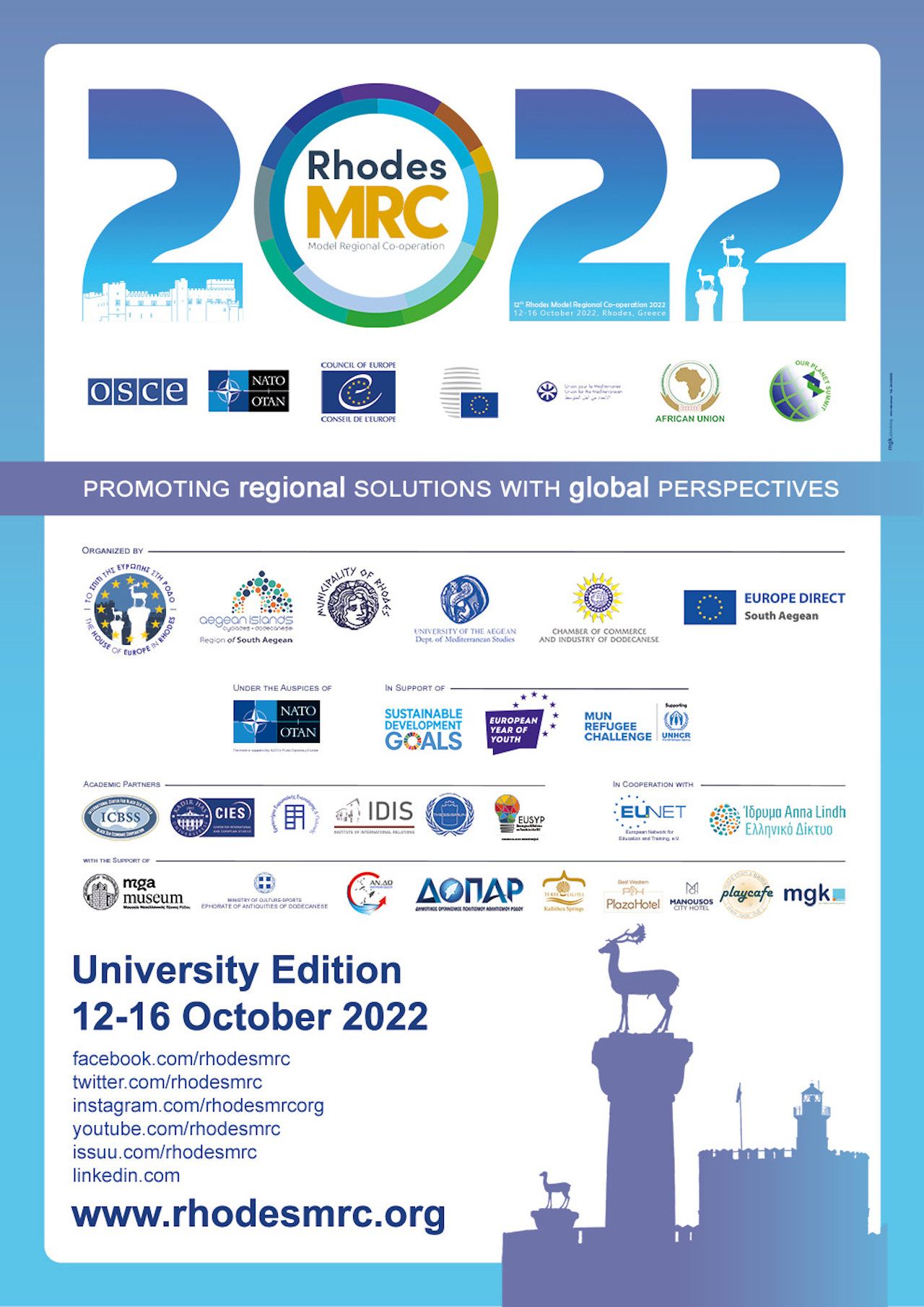 Το 12o RhodesMRC 2022 διοργανώνεται από το Σπίτι της Ευρώπης στη Ρόδο, την Περιφέρεια Νοτίου Αιγαίου, τον Δήμο Ρόδου, το Επιμελητήριο Δωδεκανήσου, το Τμήμα Μεσογειακών Σπουδών του Πανεπιστημίου Αιγαίου και του Europe Direct Νοτίου Αιγαίου.