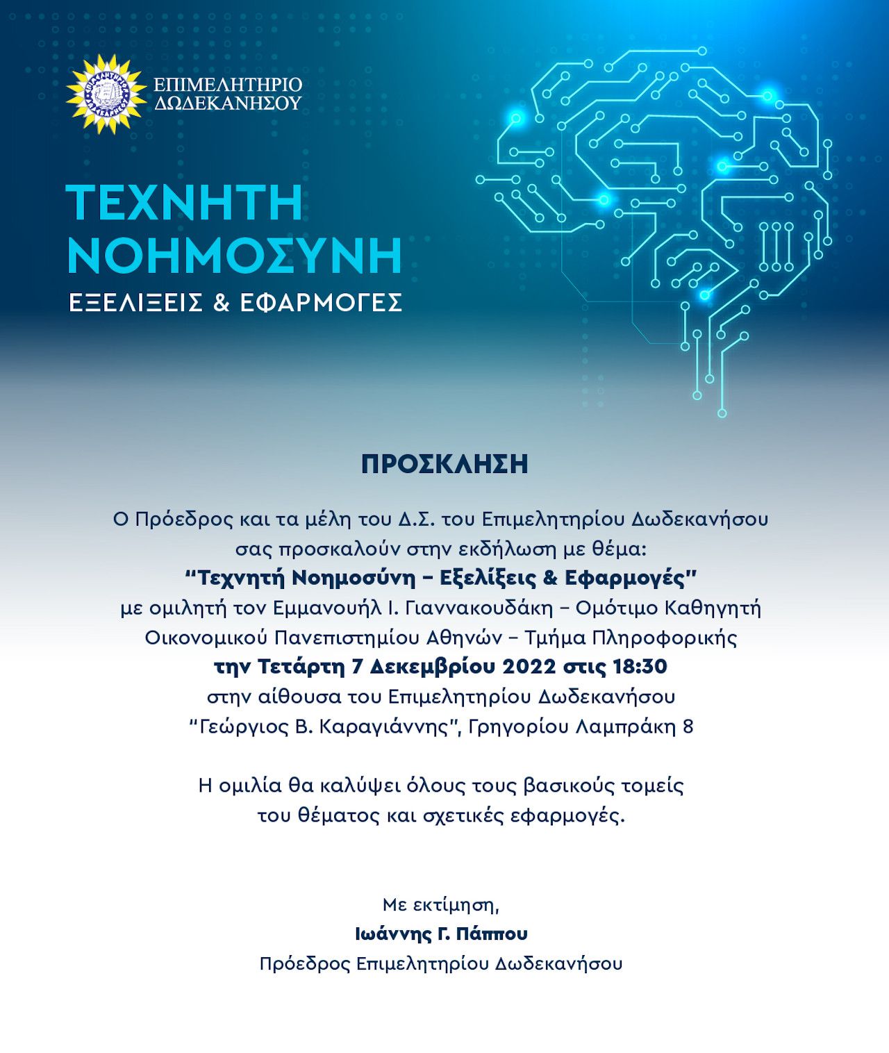 Συνημμένα θα βρείτε Πρόσκληση του Επιμελητηρίου μας για την ενημερωτική εκδήλωση με θέμα «Τεχνητή Νοημοσύνη – Εξελίξεις & Εφαρμογές» με ομιλητή τον Εμμανουήλ Ι. Γιαννακουδάκη- Ομότιμο Καθηγητή Οικονομικού Πανεπιστημίου Αθηνών- Τμήμα Πληροφορικής.