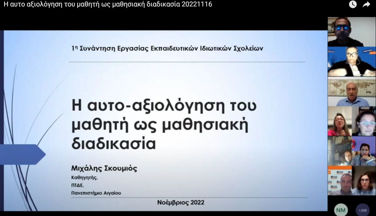 Εισηγητής στην 1η επιμορφωτική συνάντηση εκπαιδευτικών ήταν ο Μιχάλης Σκουμιός, Καθηγητής στο Παιδαγωγικό Τμήμα Δημοτικής Εκπαίδευσης του Πανεπιστημίου Αιγαίου, ο οποίος ανέπτυξε το θέμα: «Η αυτο-αξιολόγηση του μαθητή ως μαθησιακή διαδικασία». Η εισήγηση αποσκοπούσε να αποσαφηνίσει την έννοια της αυτο-αξιολόγησης του μαθητή, να εκθέσει τους λόγους που καθιστούν αναγκαία τη χρήση της, να παρουσιάσει τα στάδια εφαρμογής της και κυρίως να εξοικειώσει τους εκπαιδευτικούς με τις διάφορες διδακτικές στρατηγικές με τις οποίες μπορεί να εφαρμοστεί στο πλαίσιο της εκπαιδευτικής πράξης. Κατά τη διάρκεια της εισήγησης δημιουργήθηκαν ολιγομελείς ομάδες εργασίας εκπαιδευτικών όπου σε «εικονικά δωμάτια» οι εκπαιδευτικοί υλοποίησαν συνεργατικά δραστηριότητες.