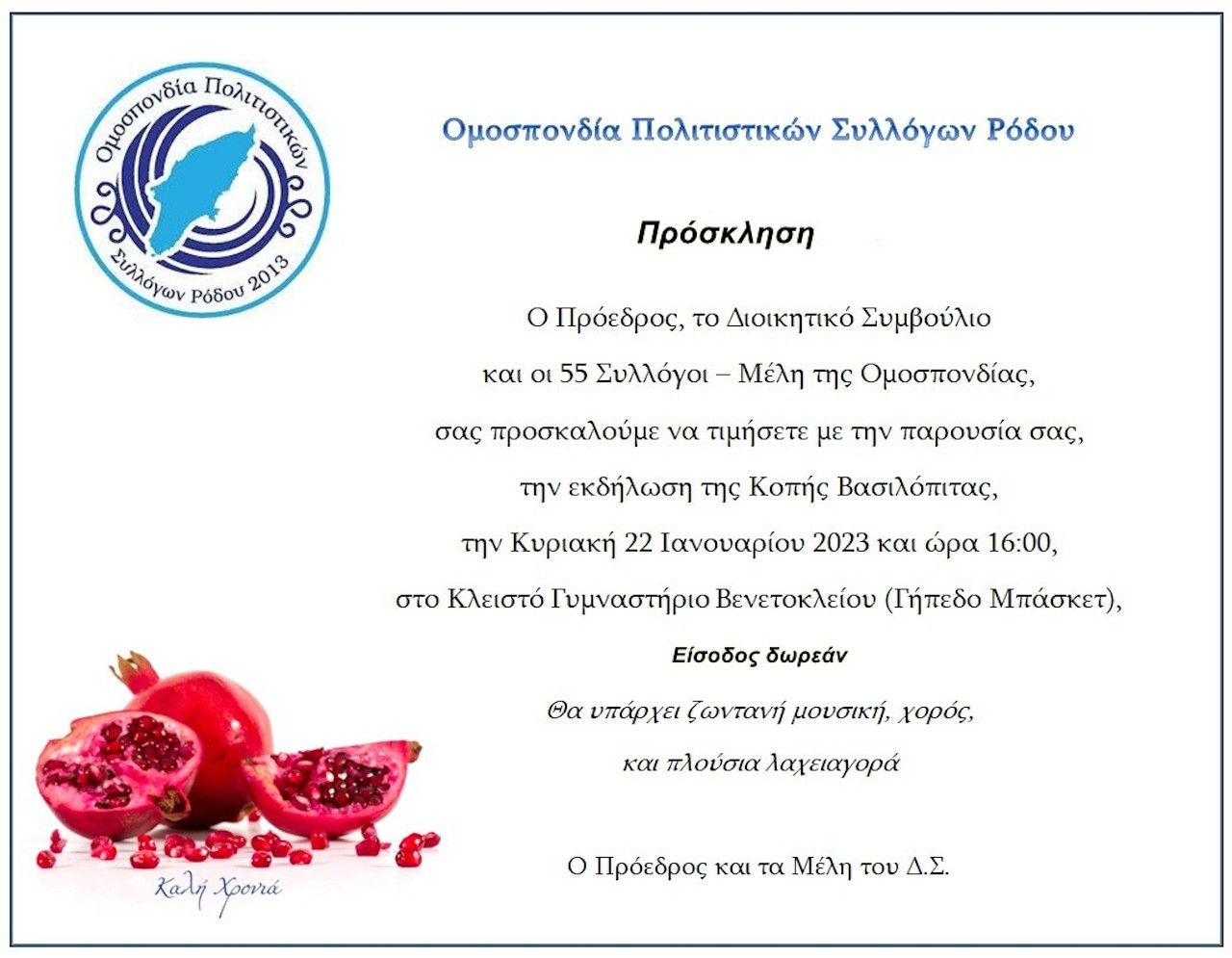 Ο Πρόεδρος, το Διοικητικό Συμβούλιο και οι 55 Σύλλογοι – Μέλη της Ομοσπονδίας, σας προσκαλούμε να τιμήσετε με την παρουσία σας την εκδήλωση της Κοπής της Βασιλόπιτας, την Κυριακή 22 Ιανουαρίου 2023 και ώρα 16:00, στο Κλειστό Γυμναστήριο Βενετοκλείου (γήπεδο μπάσκετ).