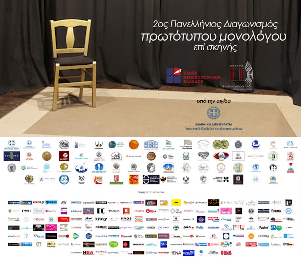 Η Ένωση Σεναριογράφων Ελλάδος έπειτα από την άκρως επιτυχημένη διεξαγωγή του 1ου Πανελλήνιου Διαγωνισμού Πρωτότυπων Μονολόγων επί Σκηνής, προκηρύσσει τον 2ο Πανελλήνιο Διαγωνισμό Πρωτότυπων Μονολόγων επί Σκηνής.