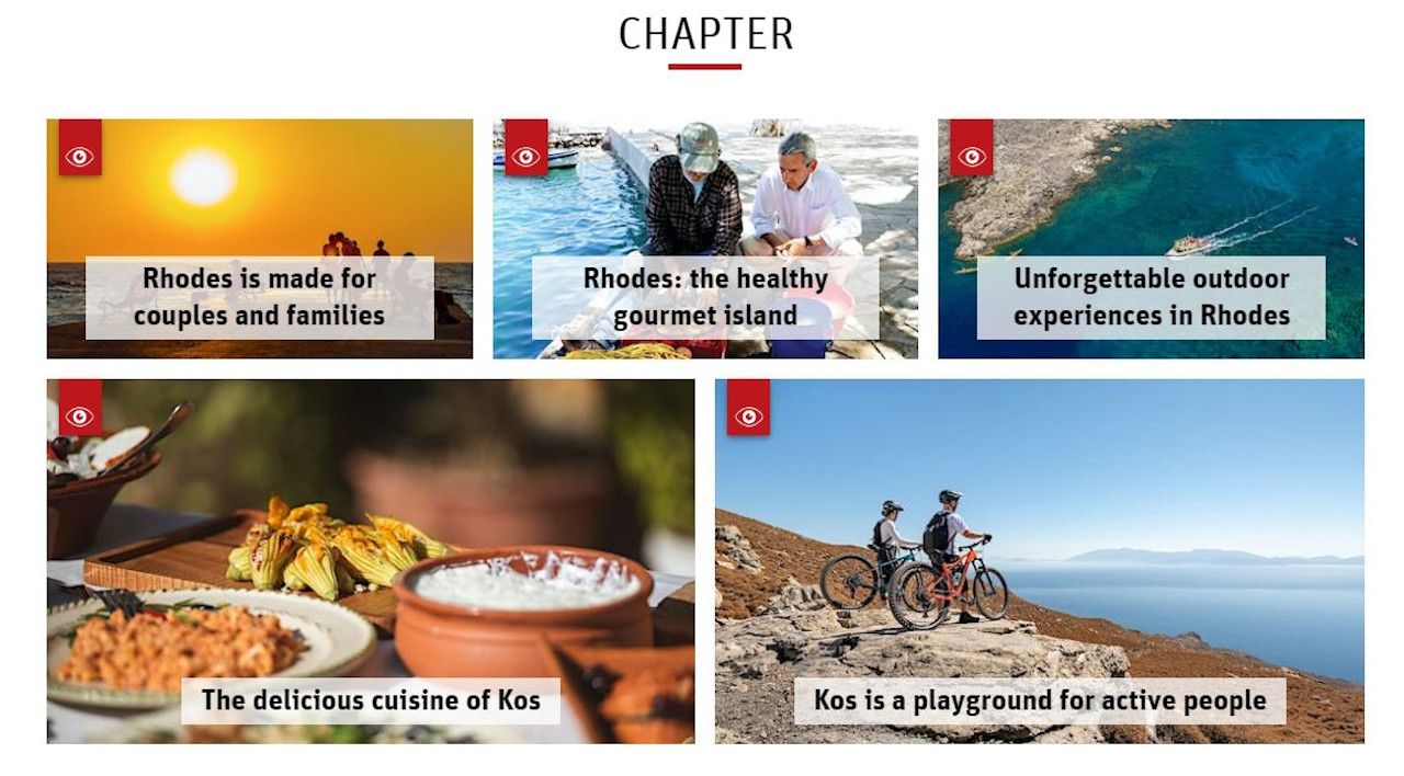 Για τα Δωδεκάνησα, στην πρώτη φάση της εκπαιδευτικής δράσης παρουσιάζονται η Ρόδος και η Κως, μέσα από την εκπαιδευτική ενότητα με τίτλο “More than just beach life”, η οποία περιέχει πέντε θεματικές: “Rhodes is made for couples and families”, “Rhodes: the healthy gourmet island”, “Unforgettable outdoor experiences in Rhodes”, “The delicious cuisine of Kos” και “Kos is a playground for active people”.