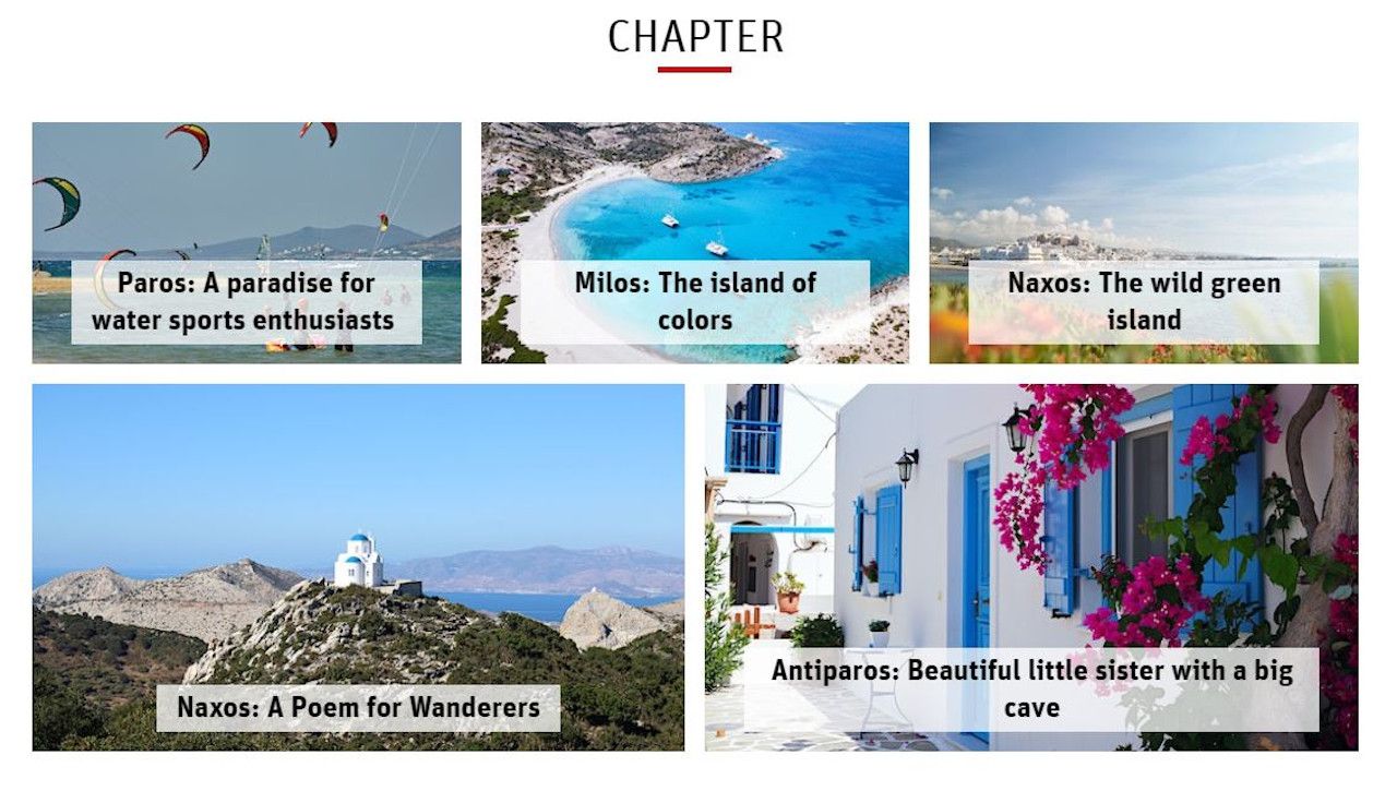 Το ψηφιακό εκπαιδευτικό υλικό που δημιουργήθηκε για τα νησιά της Περιφέρειας Νοτίου Αιγαίου απαρτίζεται από πέντε θεματικές ενότητες για τα Δωδεκάνησα και πέντε για τις Κυκλάδες. Για τις Κυκλάδες, στην πρώτη φάση της εκπαιδευτικής δράσης παρουσιάζονται τα νησιά Νάξος, Πάρος, Μήλος και Αντίπαρος μέσα από την εκπαιδευτική ενότητα με τίτλο «An island world to discover”, η οποία περιέχει πέντε θεματικές: “Paros: A paradise for sports enthusiasts”, “Milos: The island of colors”, “Naxos: The wild green island”, “Naxos: A poem for wanderers”, και “Antiparos: Beautiful little sister with a big cave”.