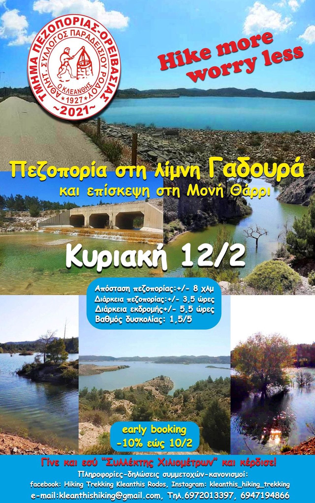 Μετά από μια μικρή παύση λόγω των κακών καιρικών συνθηκών των τελευταίων ημερών, με γνώμονα πάντα, την ασφάλεια των συμμετεχόντων σε κάθε μας πεζοπορία, είμαστε και πάλι έτοιμοι να πεζοπορίσουμε παρέα σε χειμωνιάτικη λιακάδα, γνωρίζοντας ίσως τη μεγαλύτερη και ομορφότερη τεχνητή λίμνη του Νοτίου Αιγαίου!