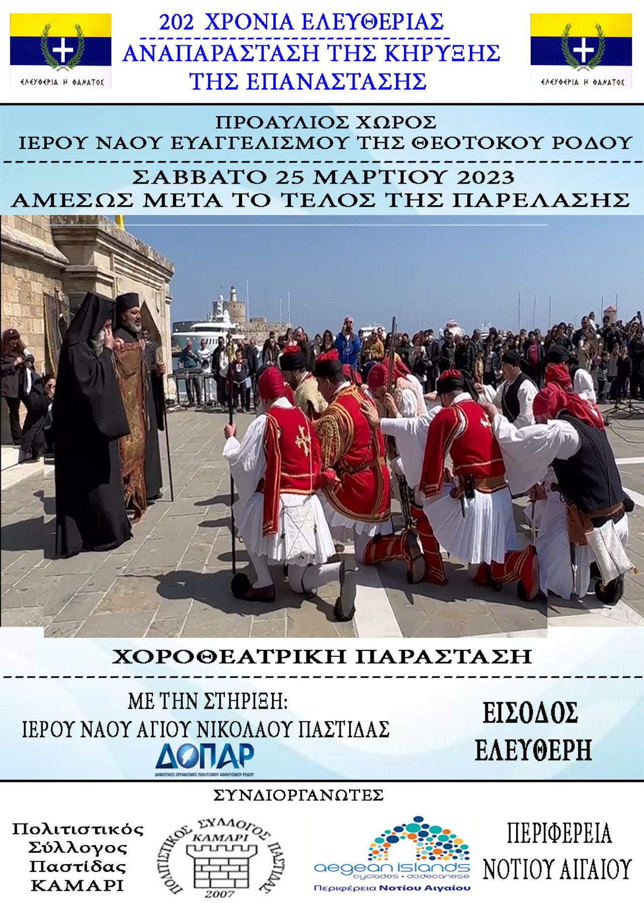 Την αναπαράσταση της ορκωμοσίας των αγωνιστών και της κήρυξης της Επανάστασης του 1821 θα παρουσιάσει και φέτος ο Πολιτιστικός Σύλλογος Παστίδας «Καμάρι» στην Πόλη της Ρόδου το Σάββατο 25/03/2023, μετά την παρέλαση, στον προαύλιο χώρο του Ιερού Ναού Ευαγγελισμού της Θεοτόκου (σιντριβάνι) σε συνδιοργάνωση με τη Περιφέρεια Νοτίου Αιγαίου, θέλοντας έτσι να αποδώσει τιμή και ευγνωμοσύνη σε όσους αγωνίστηκαν για τη δημιουργία ενός ελεύθερου, ανεξάρτητου και σύγχρονου κράτους.