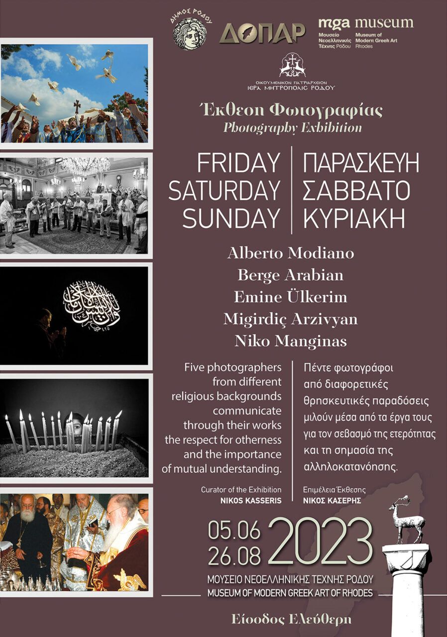 Στην πρώτη έκθεση “ΠΑΡΑΣΚΕΥΗ, ΣΑΒΒΑΤΟ, ΚΥΡΙΑΚΗ” πέντε φωτογράφοι από διαφορετικές θρησκευτικές παραδόσεις μιλούν μέσα από τα έργα τους για τον σεβασμό της ετερότητας και τη σημασία της αλληλοκατανόησης. Η σχέση του ανθρώπου με τον Θεό, η επικοινωνία με τη θρησκευτική ετερότητα, η προώθηση της αλληλοκατανόησης, του αλληλοσεβασμού και της αρμονικής συμβίωσης θρησκειών και πολιτισμών αποτυπώνονται με έναν ξεχωριστό τρόπο στις φωτογραφίες που αναδεικνύουν τη σημασία του διαλόγου με το «διαφορετικό». Θρησκευτικές πεποιθήσεις και τελετουργίες παλαιές όσο και η ανθρωπότητα, παραδόσεις και έθιμα με ρίζες να χάνονται στον χρόνο, βιώματα και μαρτυρίες που συναντήθηκαν στο μεγαλύτερο σταυροδρόμι της Ανατολής και συνυφάνθηκαν με την ιστορία της του Κωνσταντίνου Πόλεως. Οι φωτογράφοι Alberto Modiano, Berge Arabian, Emine Ülkerim, Mıgırdiç Arzivyan και Νικόλαος Μαγγίνας, αν και ανήκουν σε διαφορετικές θρησκευτικές κοινότητες (Εβραϊκή, Αρμένικη Χριστιανική, Τουρκική Μουσουλμανική, Ρωμαίικη-Ορθόδοξη Χριστιανική) συνέπραξαν καλλιτεχνικά σεβόμενοι ο ένας την παράδοση του άλλου. Οι πέντε καλλιτέχνες επισημαίνουν και προβάλλουν την αξία της συνεργασίας και της αλληλοκατανόησης προς κάθε κατεύθυνση και προς κάθε άνθρωπο καλής θέλησης. Δεν χρησιμοποιούν το λόγο αλλά τη δύναμη της πραγματικότητας μέσα από την εικόνα. Χρησιμοποιούν τη γλώσσα της “ρεπορταζιακής” φωτογραφίας ως το μέσο επικοινωνίας τους. Εικόνες ηχηρές με πρωταγωνιστές θρησκευτικούς λειτουργούς και πιστούς, ανθρώπους που λατρεύουν τον Θεό, με τη δική τους παράδοση, ενώ ζουν όλοι στην ίδια μεγάλη και ιστορική πόλη, στην Κωνσταντινούπολη. Η έκθεση πρωτοπαρουσιάστηκε στο Σισμανόγλειο Μέγαρο του Γενικού Προξενείου της Ελλάδος στην Κωνσταντινούπολη το Δεκέμβριο του 2015 και στη συνέχεια ταξίδεψε σε Αθήνα, Βόλο και Θεσσαλονίκη. Πέμπτος σταθμός η Ρόδος, μια πόλη που επίσης χαρακτηρίζεται μέσα στους αιώνες από την παρουσία και την αρμονική συνύπαρξη τριών θρησκειών.