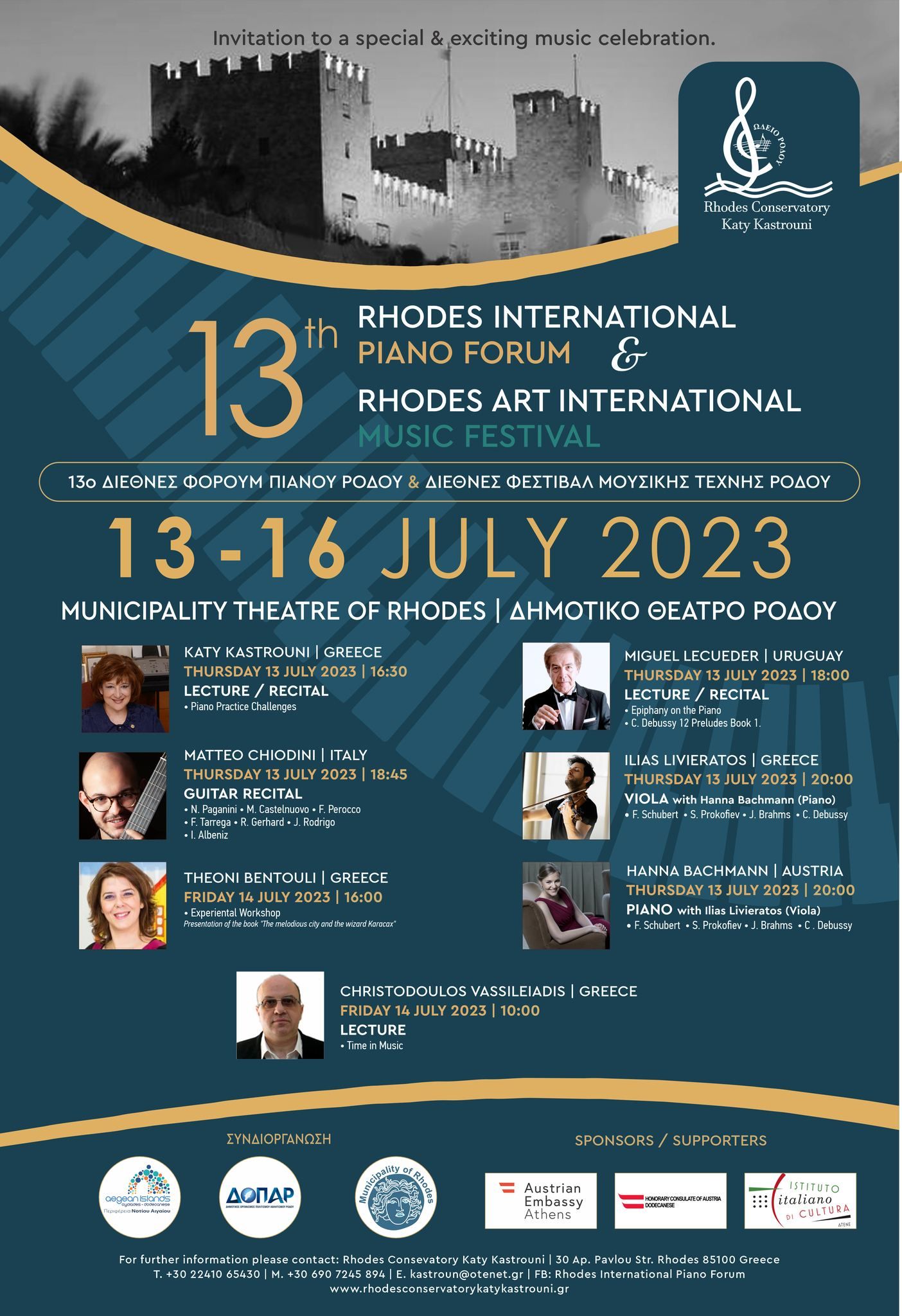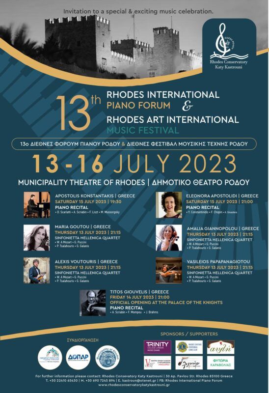 Με πρωτοβουλία του Ωδείου Ρόδου «Καίτη Καστρουνή» και συνδιοργανωτές την περιφέρεια Νοτίου Αιγαίου, τον ΔΟΠΑΡ και τον δήμο Ρόδου θα πραγματοποιηθεί για 13η χρονιά το Διεθνές Φόρουμ Πιάνου Ρόδου και Διεθνές Φεστιβάλ Μουσικής Τέχνης Ρόδου στις 13-16 Ιουλίου 2023.