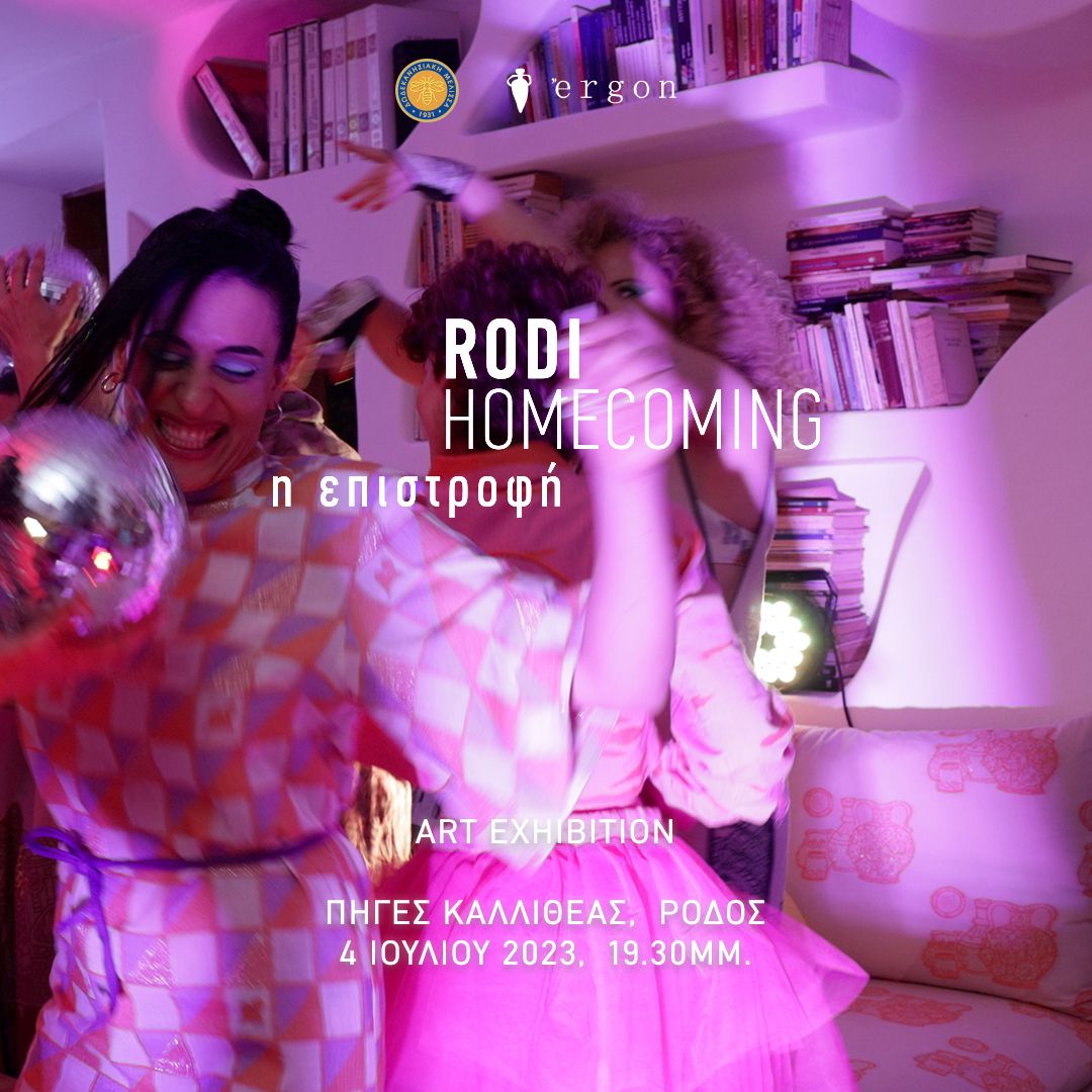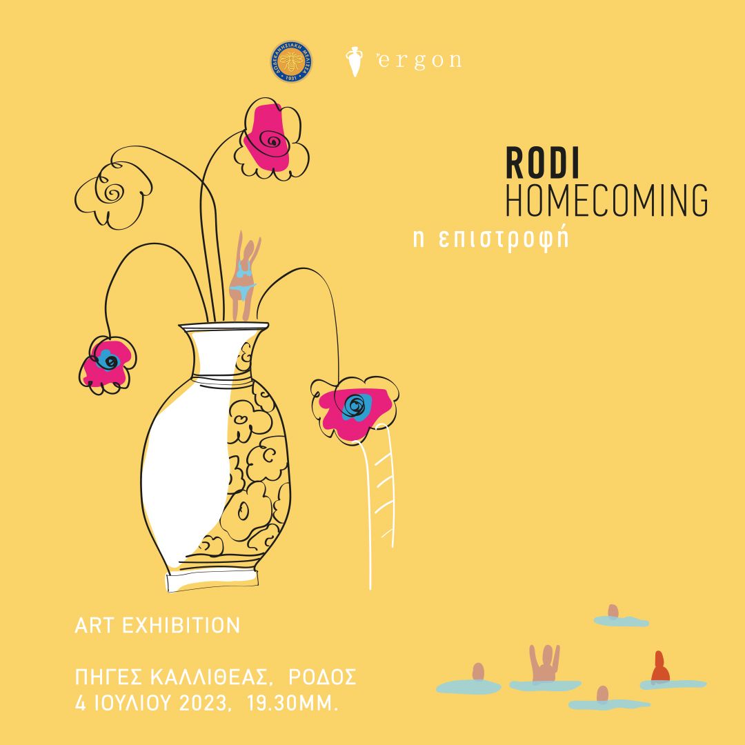 Στις 4 Ιουλίου, στις Πηγές Καλλιθέας και ώρα 19.30, υπό την αιγίδα του Δήμου Ρόδου, πραγματοποιείται η εκδήλωση – έκθεση «Rodi Homecoming – H Επιστροφή» που οργανώνει η «Δωδεκανησιακή Μέλισσα Επιτροπή Ρόδου» σε καλλιτεχνική επιμέλεια της «Ergon Mykonos». Είναι μια πρωτότυπη πολυμορφική ομαδική έκθεση τέχνης και πολιτισμού για φιλανθρωπικό σκοπό. Πραγματοποιείται στο πλαίσιο του προγράμματος ERASMUS με τίτλο: «Άυλη πολιτιστική κληρονομιά από το χθες στο σήμερα».