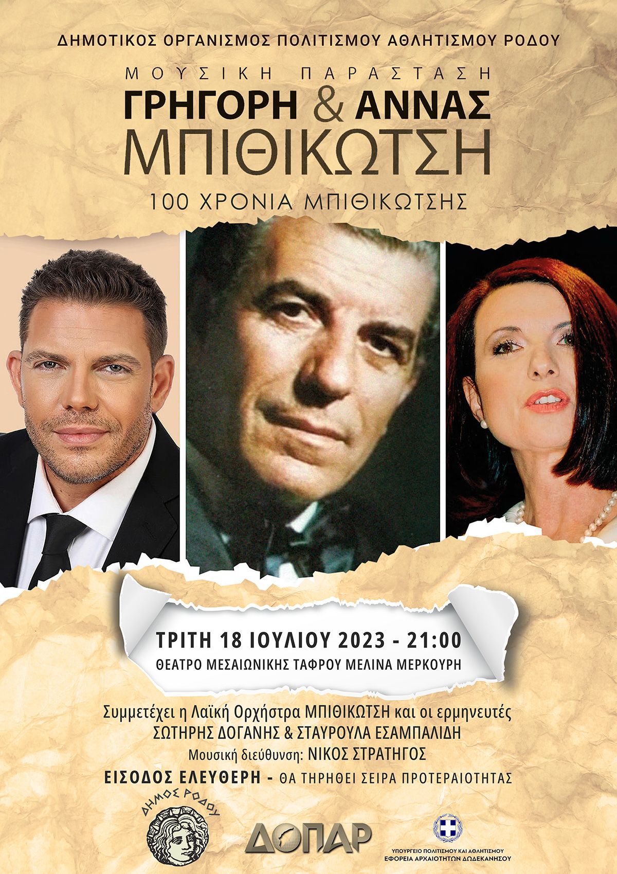 Ο Δήμος Ρόδου και ο ΔΟΠΑΡ, με την στήριξη της Εφορείας Αρχαιοτήτων Δωδεκανήσου, παρουσιάζουν μια μεγάλη μουσική παράσταση για τη ζωή και το έργο του μεγάλου Έλληνα ερμηνευτή και συνθέτη Γρηγόρη Μπιθικώτση, την Τρίτη 18 Ιουλίου 2023 και ώρα 21:00, στο Θέατρο Μεσαιωνικής Τάφρου Μελίνα Μερκούρη. Η μουσική παράσταση αποτελεί ένα αφιέρωμα που επιμελήθηκαν και παρουσιάζουν τα δύο παιδιά του, ο καλλιτέχνης Γρηγόρης Μπιθικώτσης και η λογοτέχνης Άννα Μπιθικώτση.