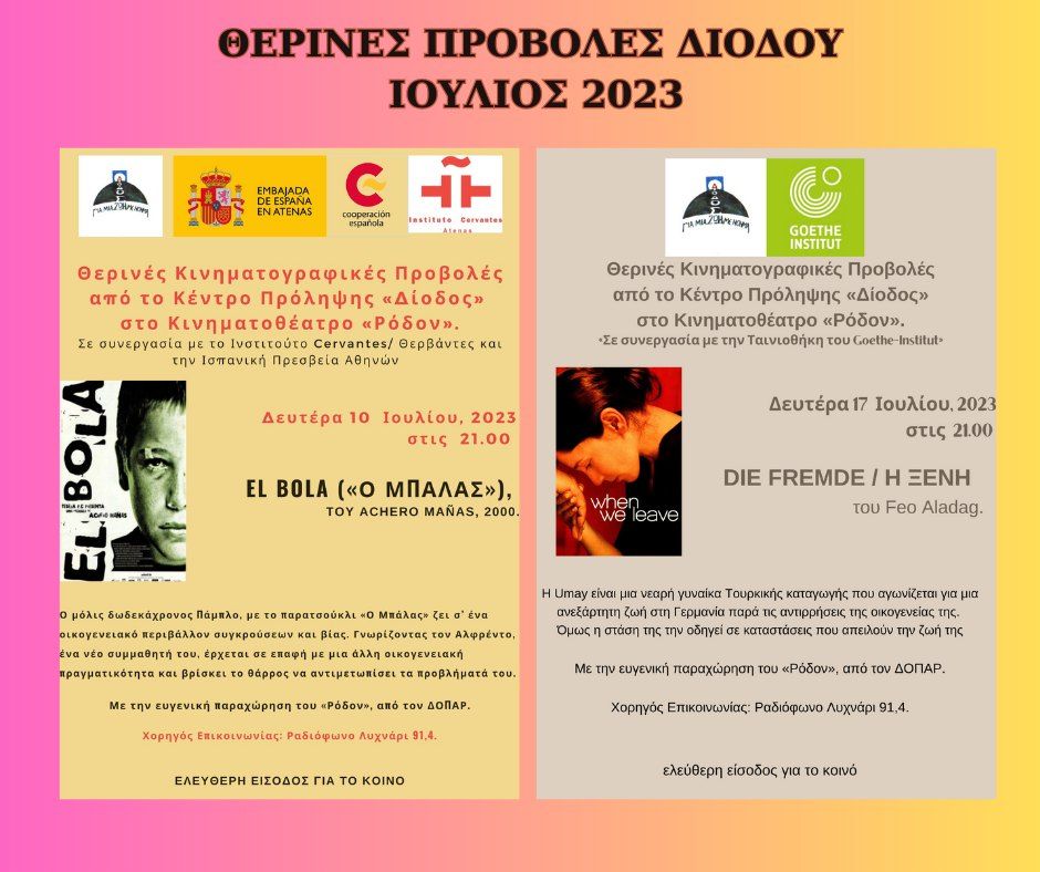 Το Κέντρο Πρόληψης Δίοδος σας προσκαλεί σε *δύο κινηματογραφικές προβολές για τον μήνα Ιούλιο, σε συνεργασία με το Ινστιτούτα Cervantes & Goethe, με ελεύθερη είσοδο για το κοινό, στο Κινηματοθέατρο “Ρόδον”, με την ευγενική παραχώρηση του ΔΟΠΑΡ.