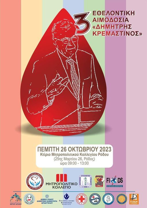 Η αιμοδοσία είναι πράξη αγάπης και απόδειξη κοινωνικής ευαισθησίας. Για τους λόγους αυτούς, ο Σύλλογος Εθελοντών Αιμοδοτών Ρόδου «Άγιος Εφραίμ» με τον Ιατρικό Σύλλογο Ρόδου και το Μητροπολιτικό Κολλέγιο Ρόδου, σε συνεργασία με την Περιφέρεια Νοτίου Αιγαίου, το Δήμο Χάλκης, τη Δημοτική Κοινότητα Αρχαγγέλου, το Εργατοϋπαλληλικό Κέντρο Ρόδου, το Παράρτημα Ρόδου του Ελληνικού Ερυθρού Σταυρού, […]