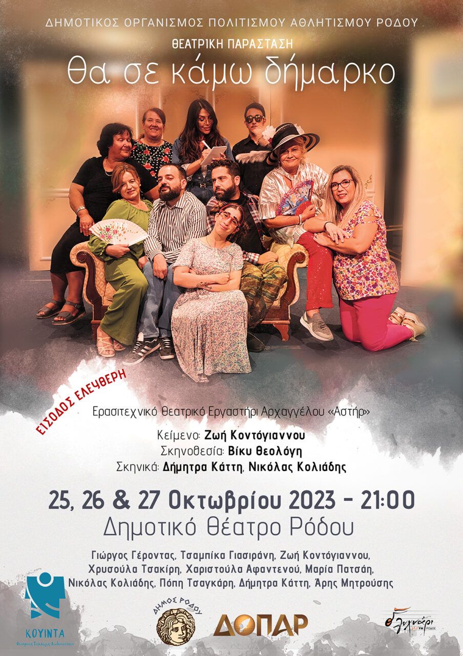 Το Ερασιτεχνικό Θεατρικό Εργαστήρι Αρχαγγέλου «Αστήρ» παρουσιάζει την παράσταση «Θα σε κάμω δήμαρκο». Πρόκειται για μια κωμωδία καταστάσεων στην αρχαγγελίτικη διάλεκτο για όλη την οικογένεια. Οι παραστάσεις θα δοθούν στις 25, 26 και 27 Οκτωβρίου στο Δημοτικό Θέατρο Ρόδου στις 21.00 η ώρα και στις 10 Νοεμβρίου ημ. Παρασκευή και 12 Νοεμβρίου ημ. Κυριακή στο Πνευματικό Κέντρο Ταξιαρχών […]