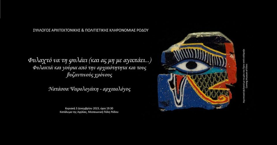 Ο Σύλλογος Αρχιτεκτονικής και Πολιτιστικής Κληρονομιάς Ρόδου σας προσκαλεί την Κυριακή 3 Δεκεμβρίου 2023 και ώρα 19:30 στην ομιλία της αρχαιολόγου Νατάσσας Ψαρολογάκη με τίτλο: “Φυλαχτό να τη φυλάει (και ας μη με αγαπάει…) – Φυλακτά και γούρια από την αρχαιότητα και τους βυζαντινούς χρόνους”. Σε μία ιστορική αναδρομή από την αρχαιότητα μέχρι και τις […]