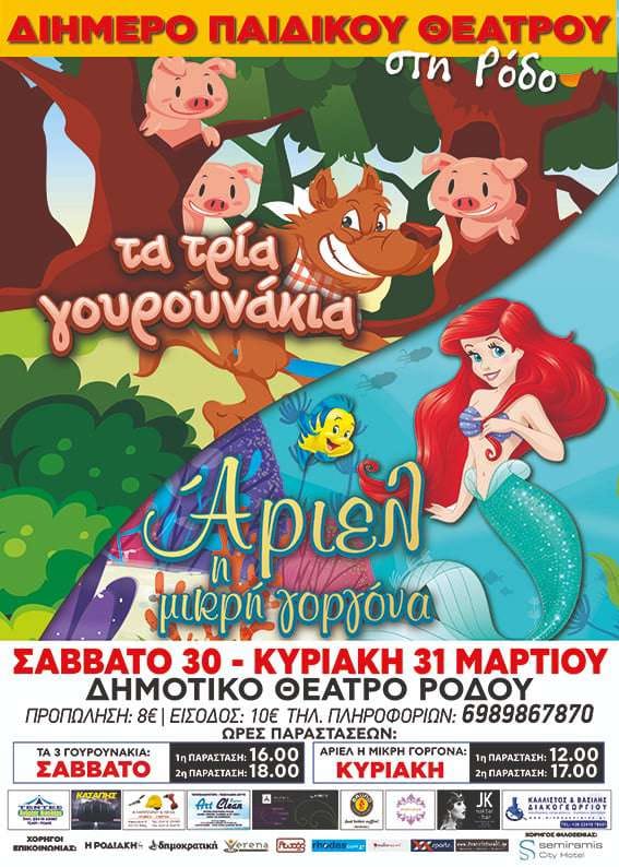 Με χαρά σας ανακοινώνουμε ότι έρχεται στην Ρόδο,ένα όμορφο διήμερο παιδικού θεάτρου με δύο εξαιρετικές παραστάσεις!!!! Το Σάββατο 30 Μαρτίου στο Δημοτικό θέατρο,η λατρεμένη παράσταση ”ΤΑ ΤΡΙΑ ΓΟΥΡΟΥΝΑΚΙΑ ” και την Κυριακή 31 Μαρτίου για πρώτη φορά στην Ρόδο ,το μαγευτικό παραμύθι του Χανς Κρίστιαν Άντερσεν, ”ΑΡΙΕΛ ,Η ΜΙΚΡΗ ΓΟΡΓΟΝΑ” , ‘!!!!! Δύο υπέροχες διαδραστικές […]