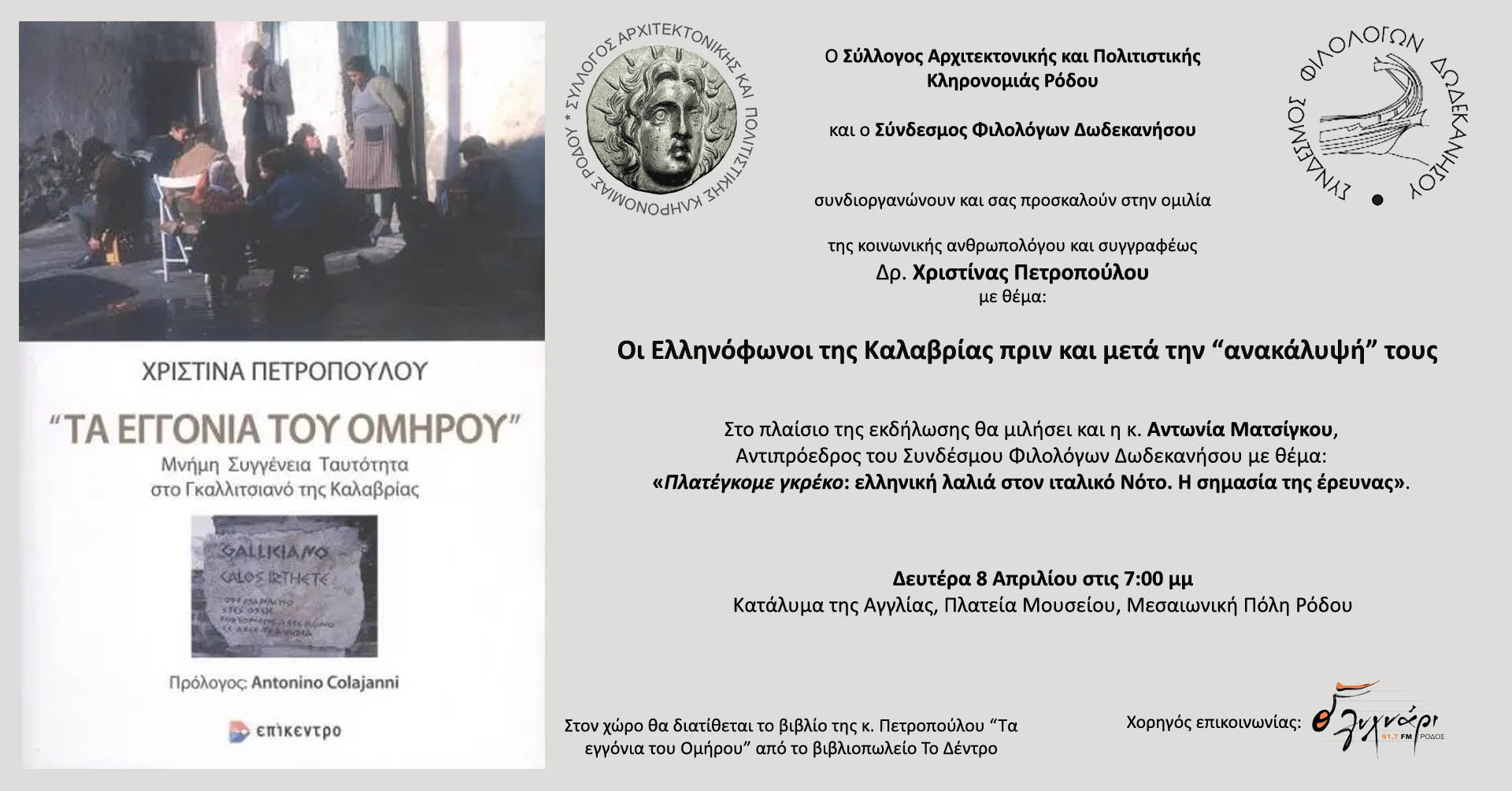 Ο Σύλλογος Αρχιτεκτονικής και Πολιτιστικής Κληρονομιάς Ρόδου και ο Σύνδεσμος Φιλολόγων Δωδεκανήσου συνδιοργανώνουν και σας προσκαλούν στην ομιλία της κοινωνικής ανθρωπολόγου και συγγραφέως Δρ. Χριστίνας Πετροπούλου με τίτλο: «Οι Ελληνόφωνοι της Καλαβρίας πριν και μετά την “ανακάλυψή” τους».
