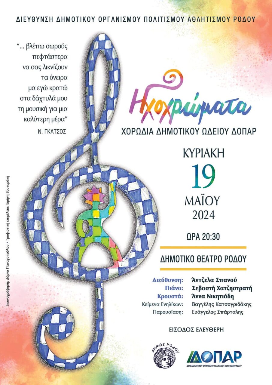 Με τον τίτλο αυτό, τα τελευταία τρία χρόνια, η χορωδία ενηλίκων του Δημοτικού Ωδείου Ρόδου παρουσιάζει την δουλειά της σε μία ετήσια συναυλία: Ηχοχρώματα, μια πανδαισία ήχων… Έτσι και εφέτος την Κυριακή 19 Μαΐου 2024 στις 8.30 το βράδυ, στο Δημοτικό Θέατρο Ρόδου θα παρουσιαστεί η μοναδικής αισθητικής και ποιότητας συναυλία της Χορωδίας αυτής, με […]