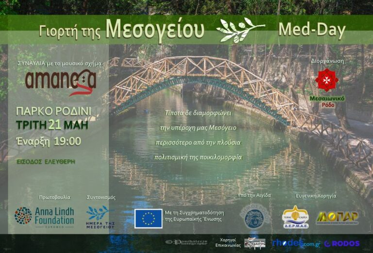 Το Μεσαιωνικό Ρόδο και το Ίδρυμα Anna Lindh σας προσκαλoύν σε ένα ταξίδι που ξεπερνά τα όρια και ενώνει τους ανθρώπους μέσω της δύναμης της μουσικής. Μια εξαιρετική ευκαιρία να γιορτάσουμε τη Μεσόγειο σε όλο της τον πλούτο και την ποικιλομορφία της. Παράλληλες εκδηλώσεις θα πραγματοποιηθούν την ίδια μέρα σε πολλές χώρες, από φορείς – μέλη του ALF, στην Ευρωμεσογειακή περιοχή.