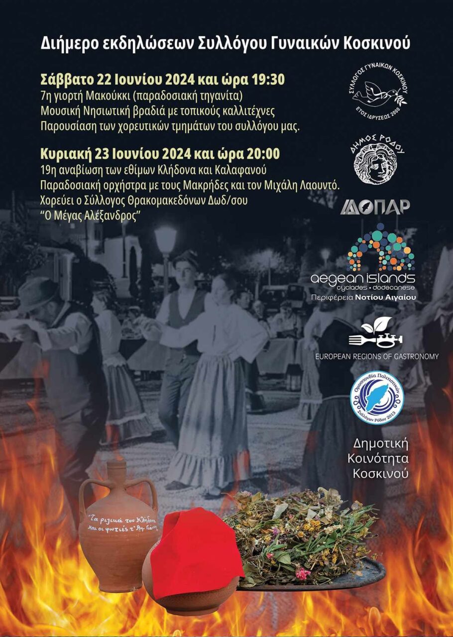 Ο Σύλλογος Γυναικών Κοσκινού διοργανώνει εκδηλώσεις Το Σάββατο 22 Ιουνίου 2024 και ώρα 19:30 στην κεντρική πλατεία Κοσκινού θα πραγματοποιηθεί η 7η γιορτή Μακούκκι (παραδοσιακή τηγανίτα). Θα γίνει παρουσίαση των χορευτικών τμημάτων του συλλόγου Γυναικών Κοσκινού και θα ακολουθήσει μουσική παραδοσιακή βραδιά με ντόπιο μουσικό σχήμα. Την Κυριακή 23 Ιουνίου για 19η χρονιά και ώρα […]