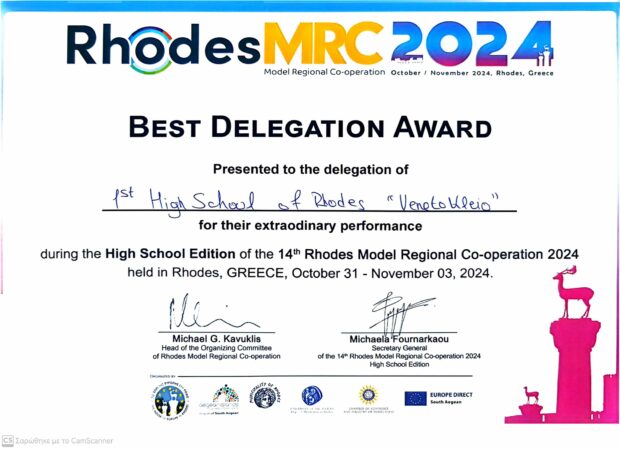 Το 1ο ΓΕΛ Ρόδου – Βενετόκλειο συμμετείχε στο 14ο Συνέδριο Προσομοίωσης Rhodes Model Regional Co-operation (MRC) για μαθητές/τριες Δευτεροβάθμιας Εκπαίδευσης κατά το διάστημα από 31 Οκτωβρίου έως 03 Νοεμβρίου 2024, το οποίο διοργανώνεται από το Σπίτι της Ευρώπης στη Ρόδο.